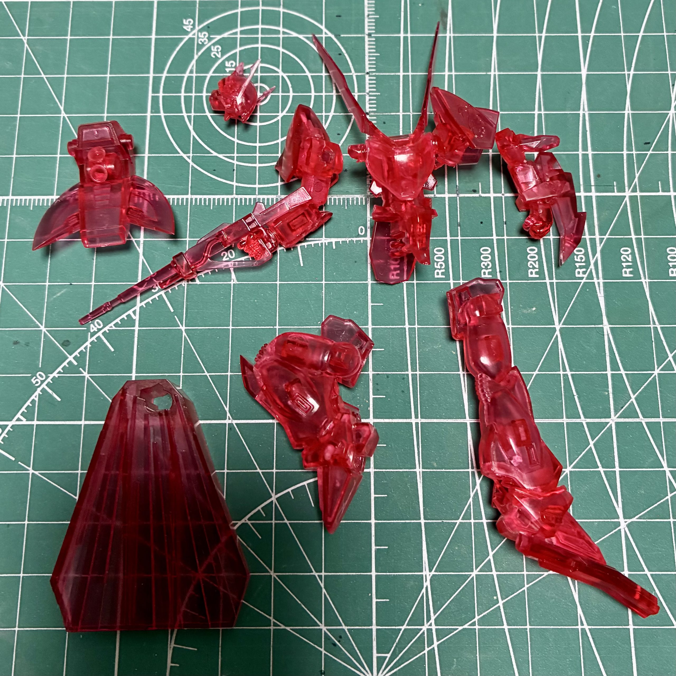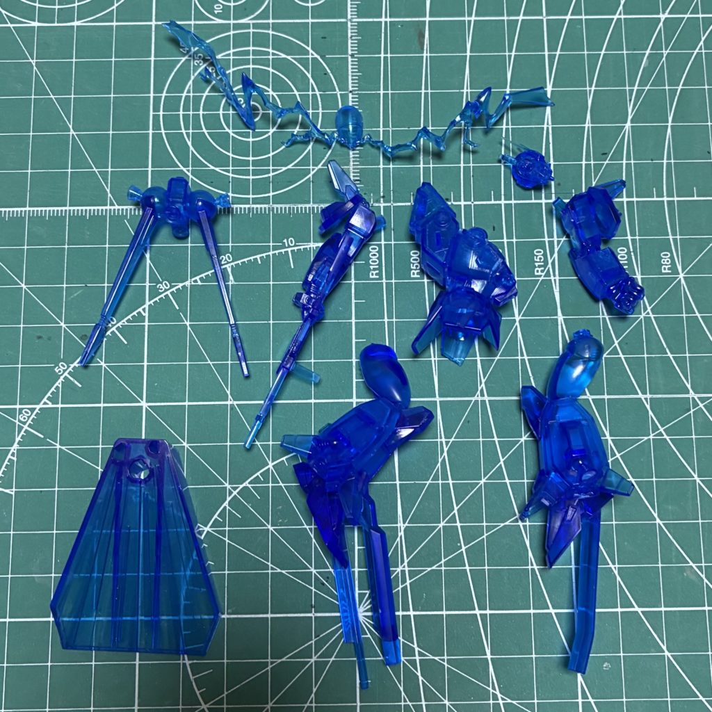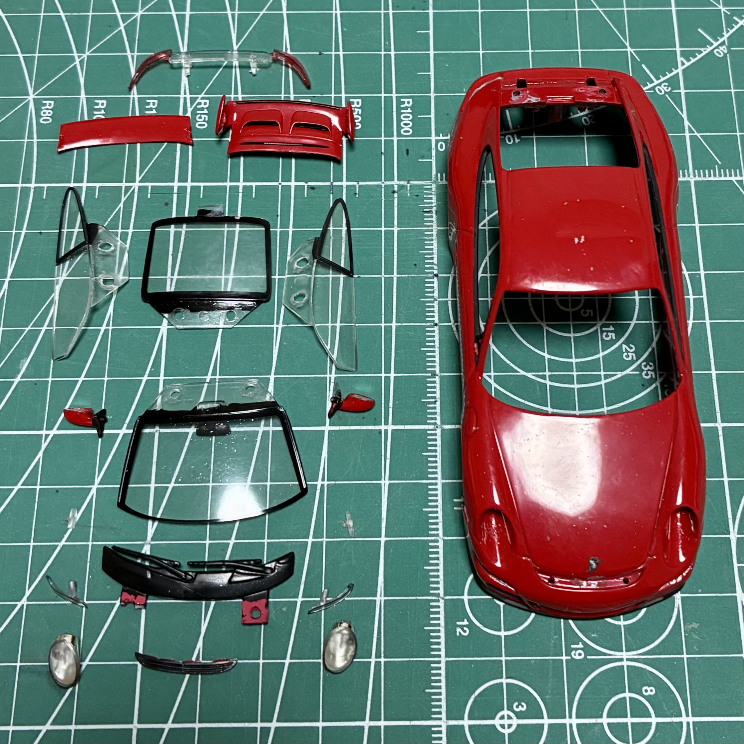表面に凸モールドが多く、スポーツカーのようにピカピカに仕上げるつもりはないので、バリやパーティングラインの目立つ部分を中心にファンデーショングレーを吹いて600番のヤスリで軽く表面を整えました。