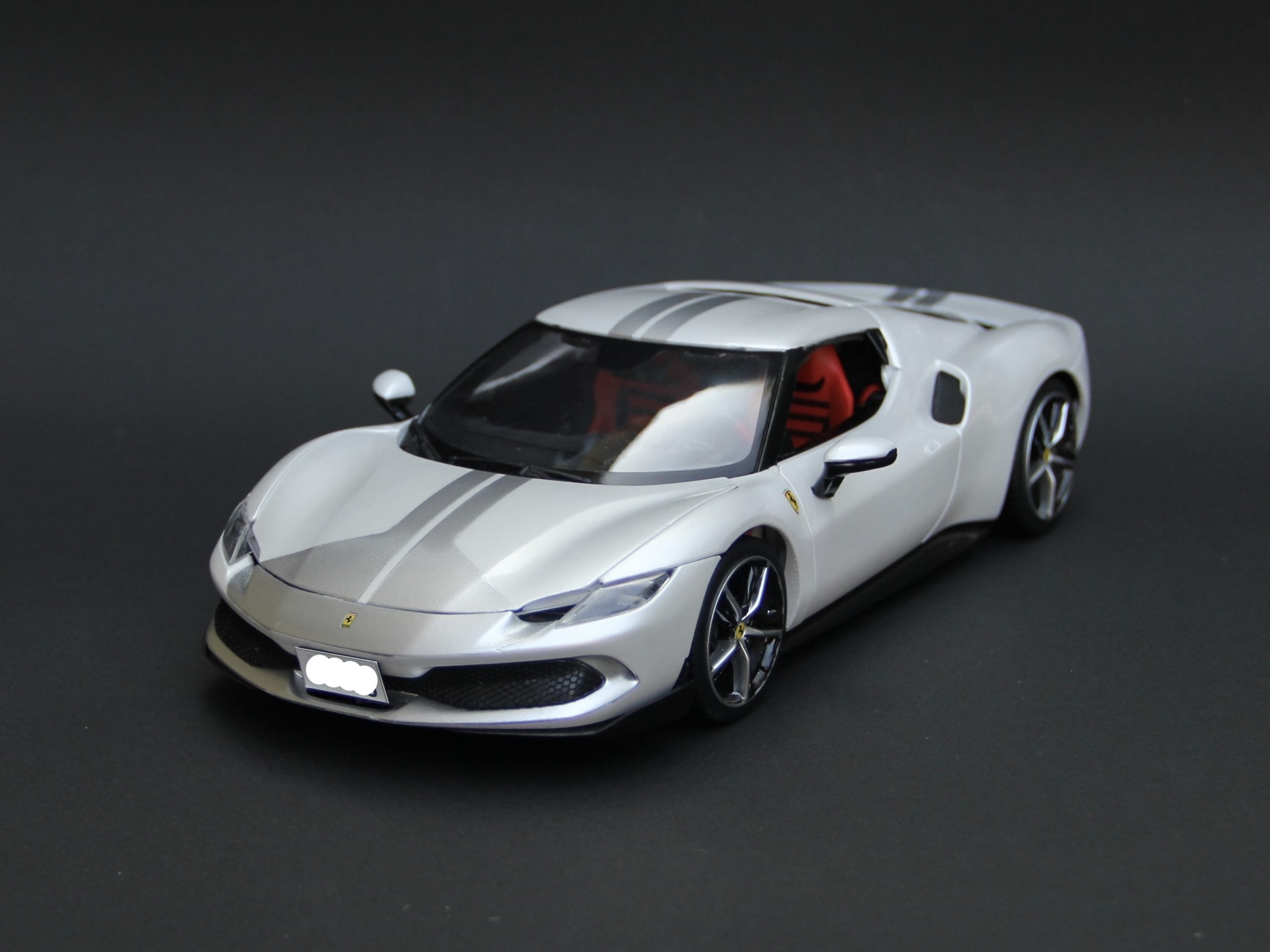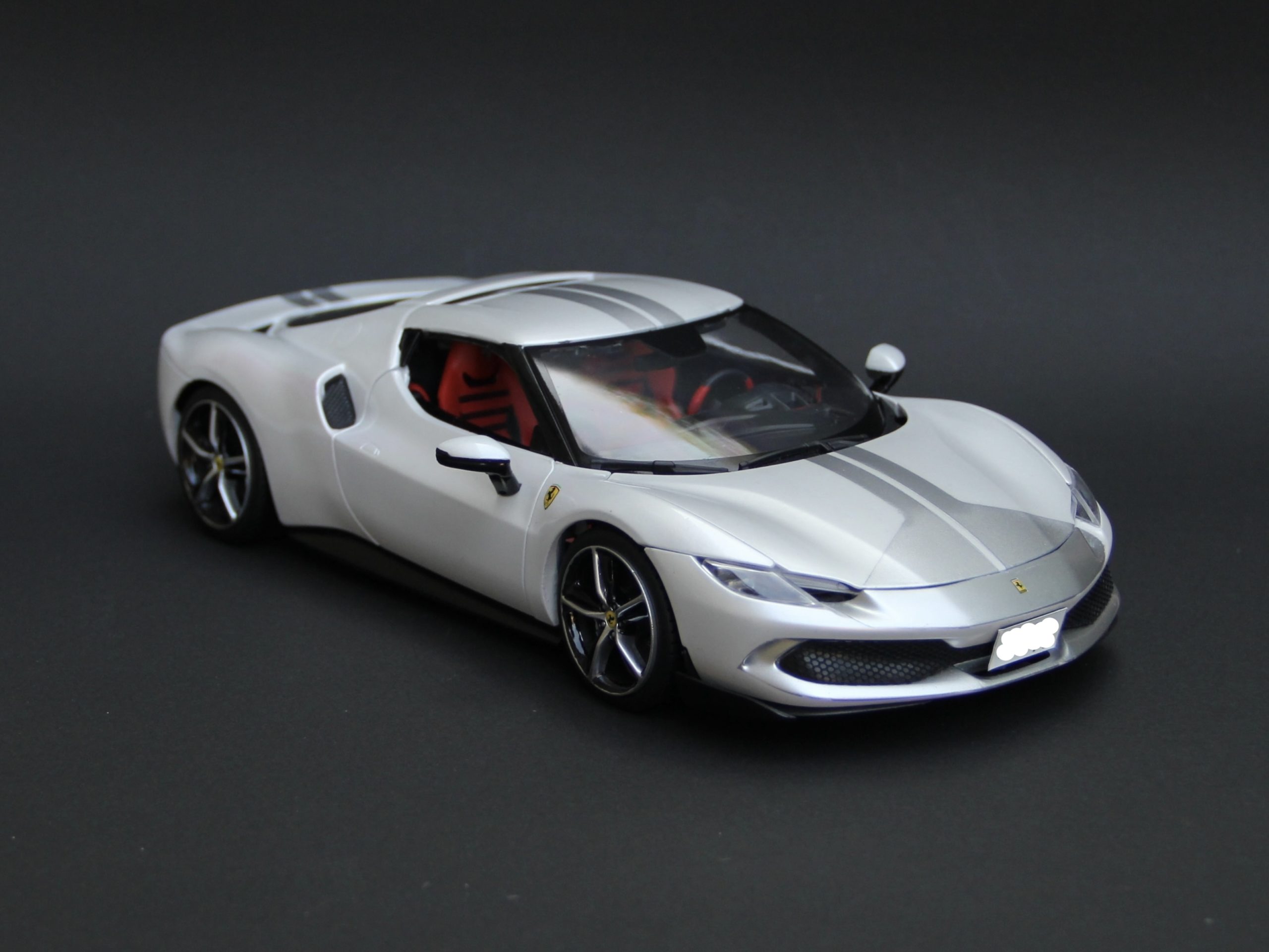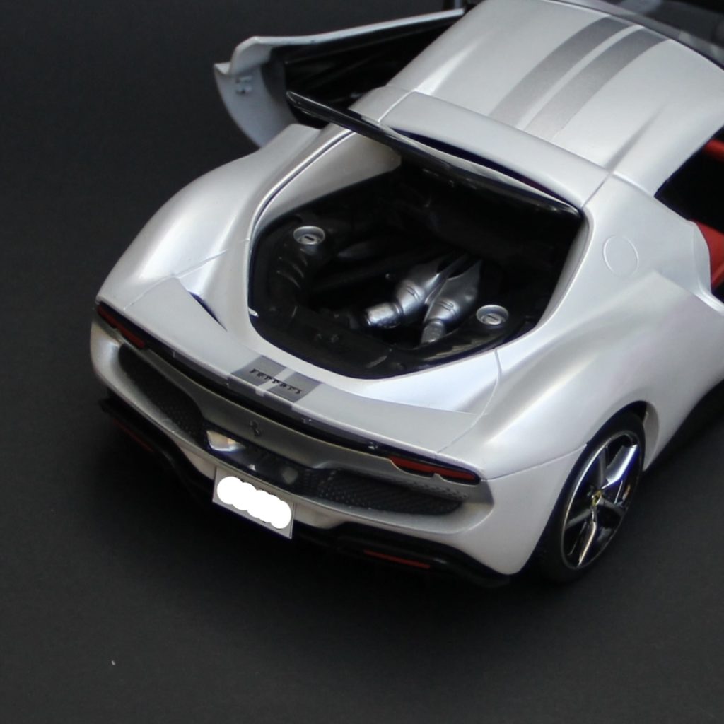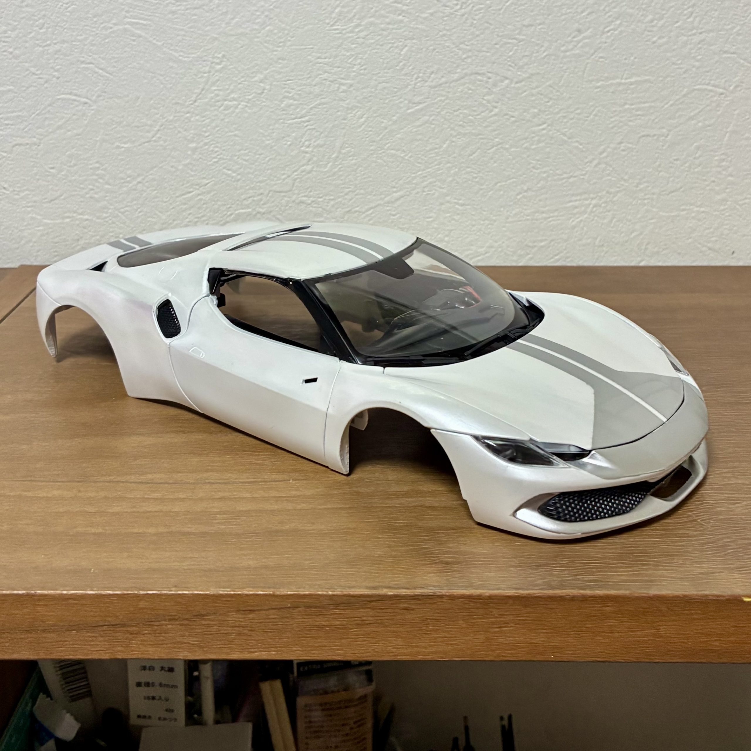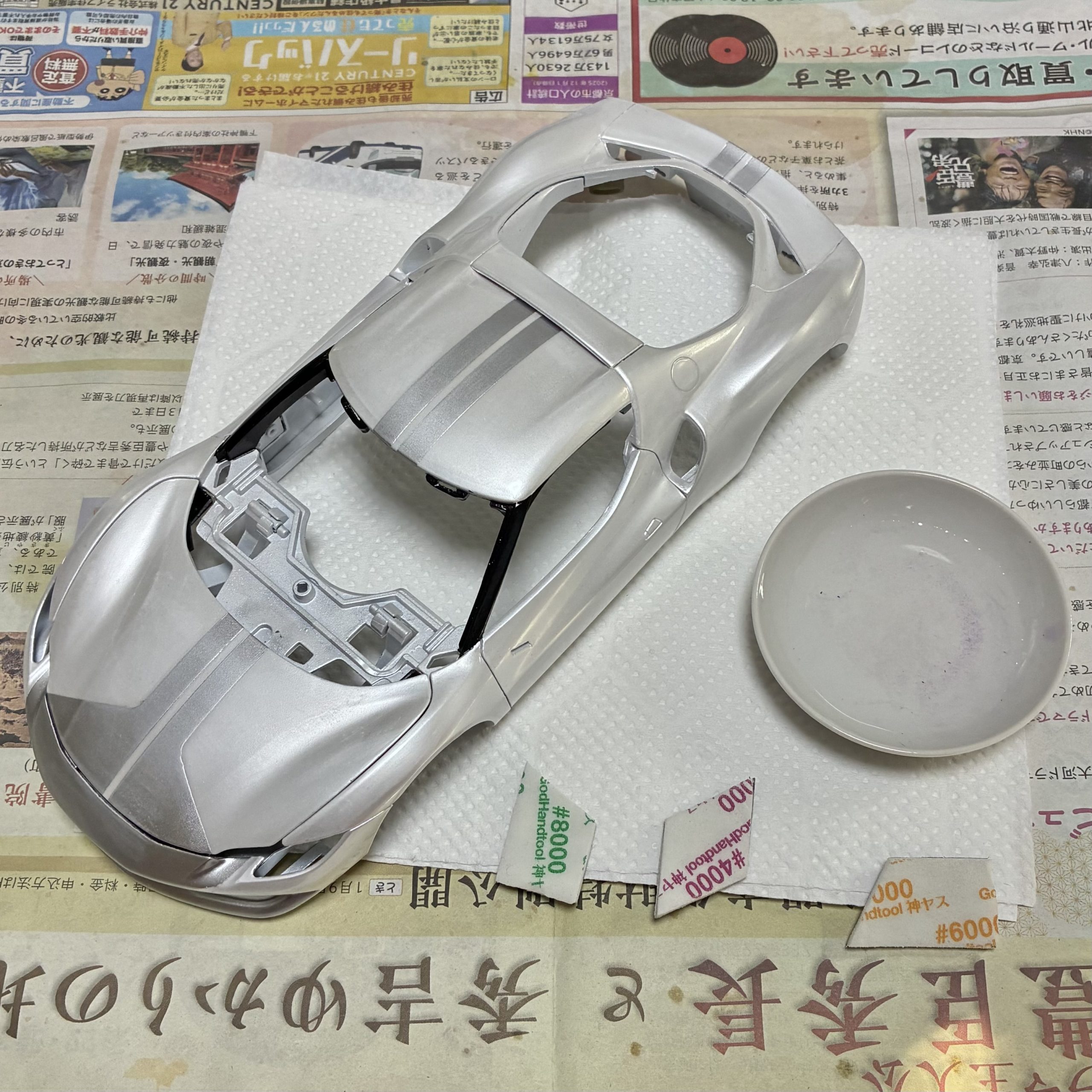 裏からセミグロスブラックでウィンドウを塗装。キットにマスキングシールが付属していて非常に助かりました。リアウィンドウは自分でマスキングをしてシルバーで塗装。