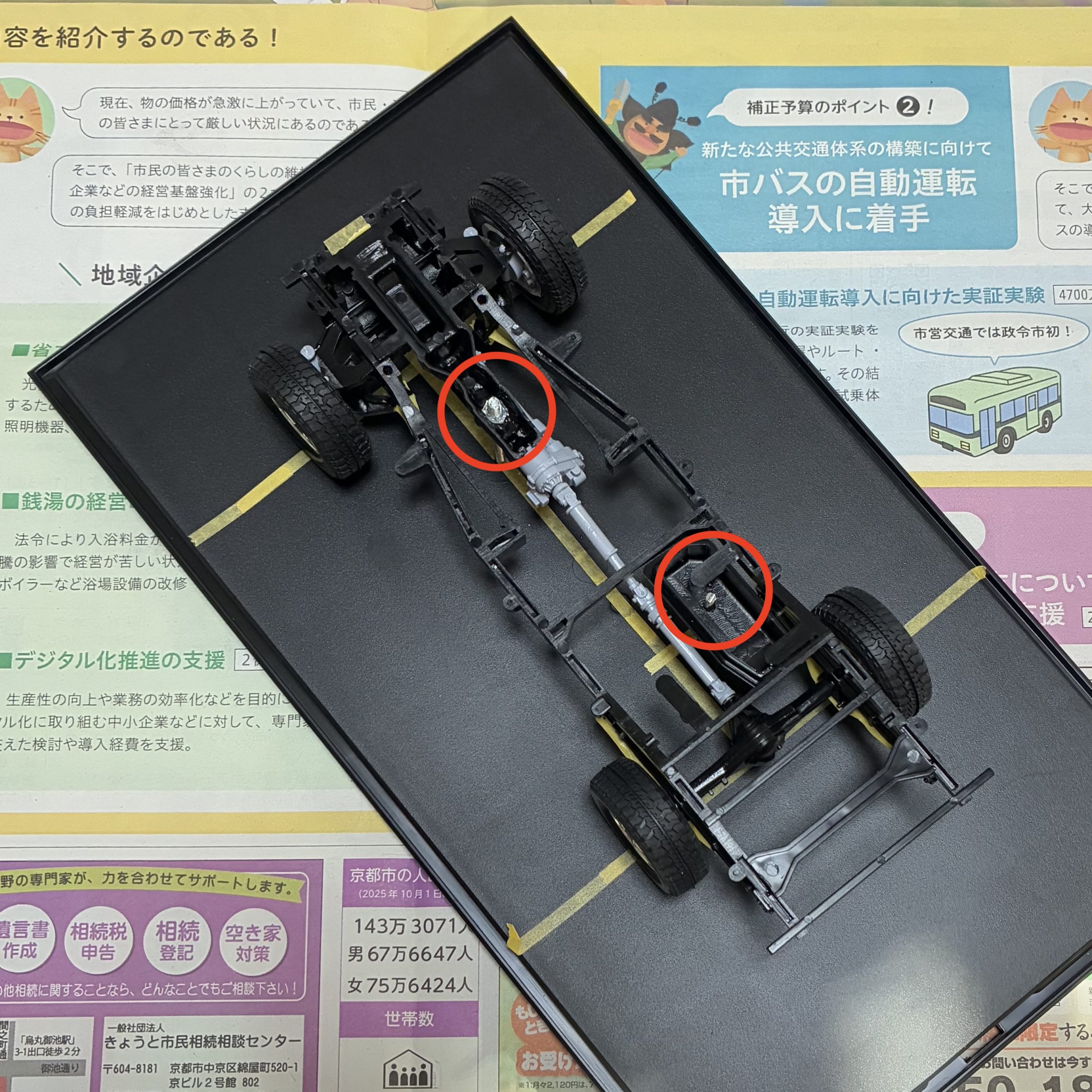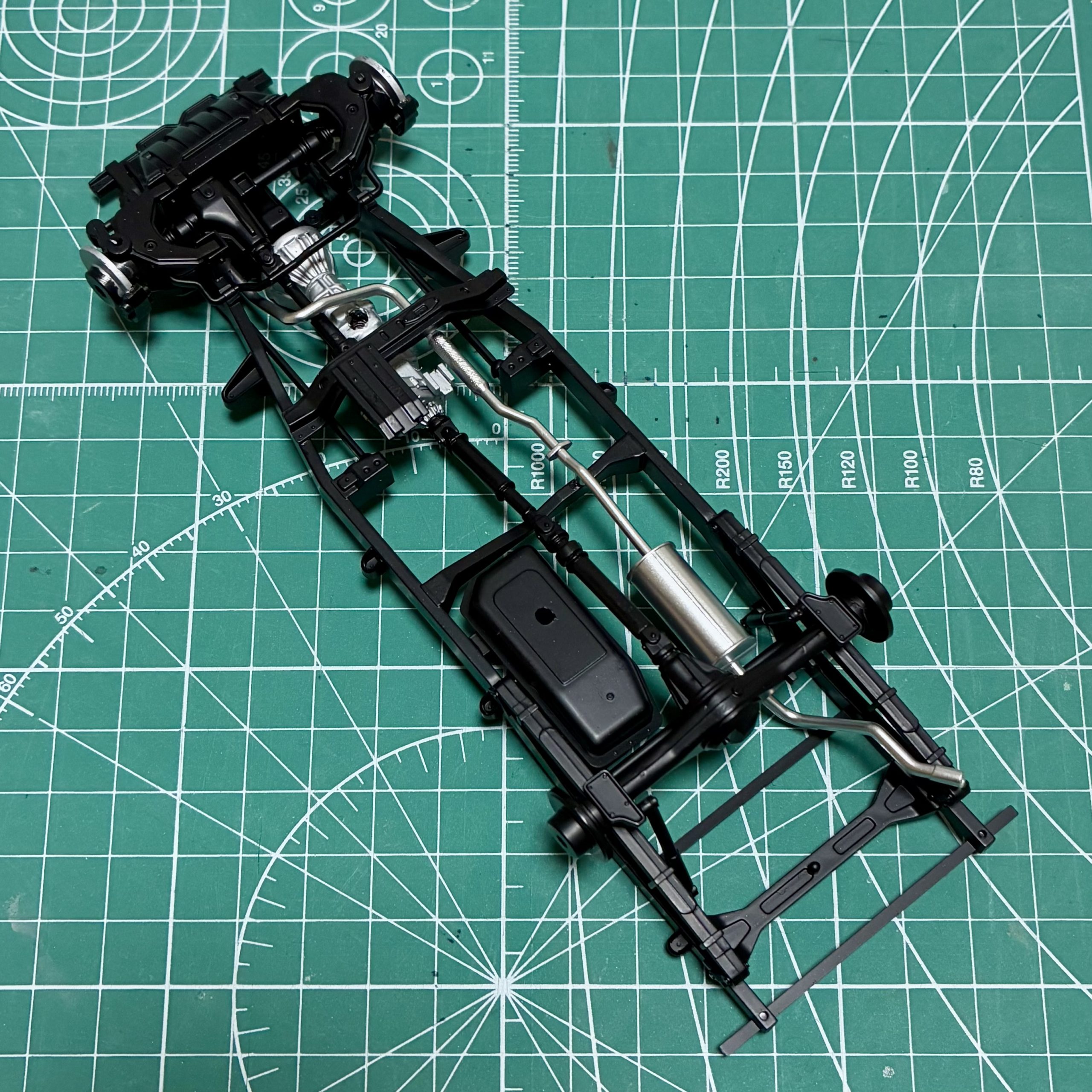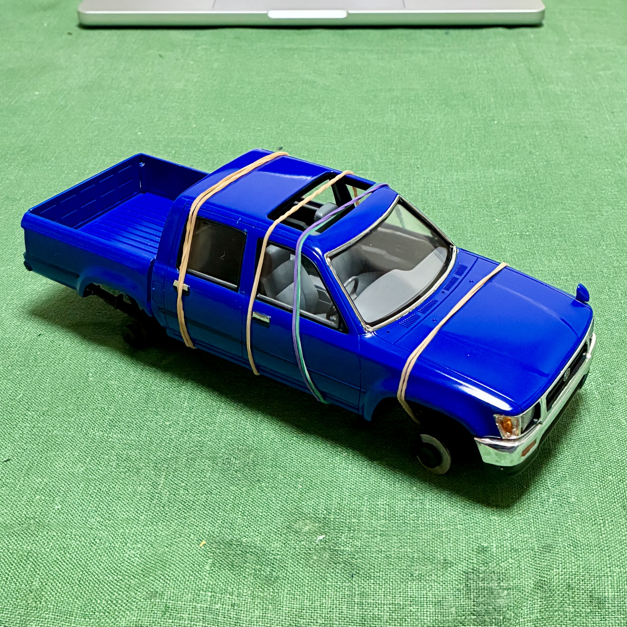かなり精度が低いキットなので、そのままではタイヤがキチンと接地しません。そこで取り付けダボを大きめに空けて、硬化に時間がかかるエポキシ接着剤を使用。接着剤が硬化する間に車体の歪みを調整します。