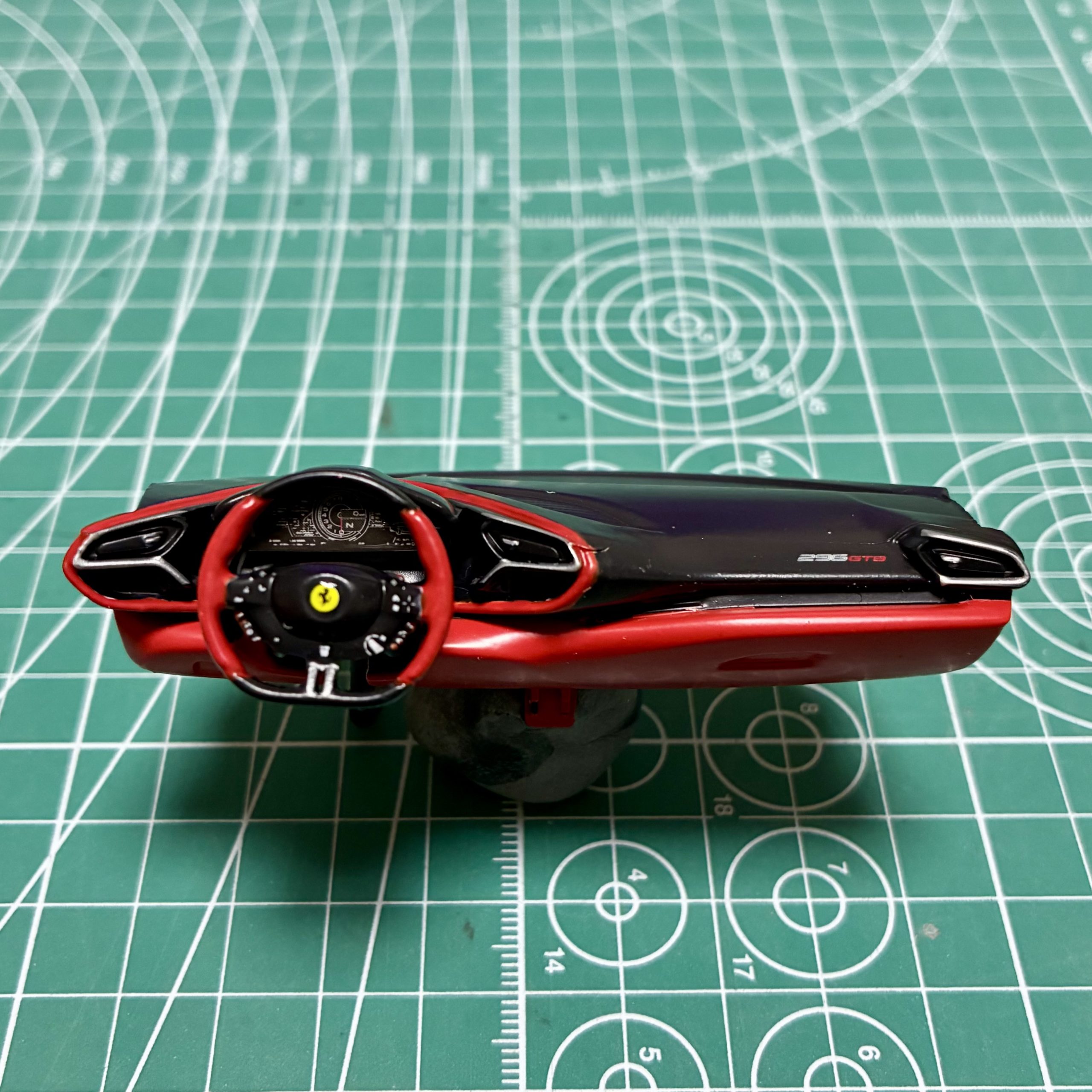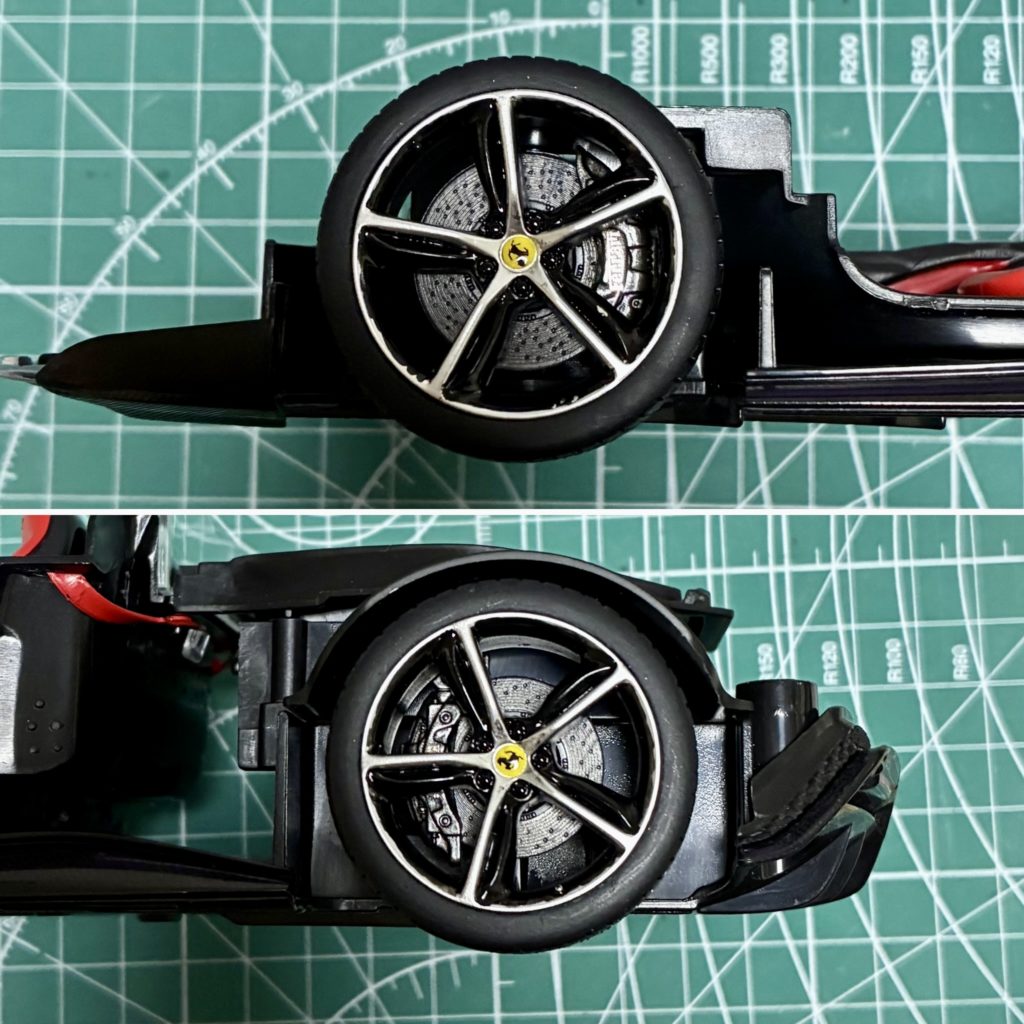ホイールのシルバーを塗り直して、黒部分はエナメル塗料を筆塗り。ブレーキキャリパーはメタルブラックで塗装。中央の跳ね馬とキャリパーの「Ferrari」エンブレムはMSMクリエイションのシールを貼り付けました。