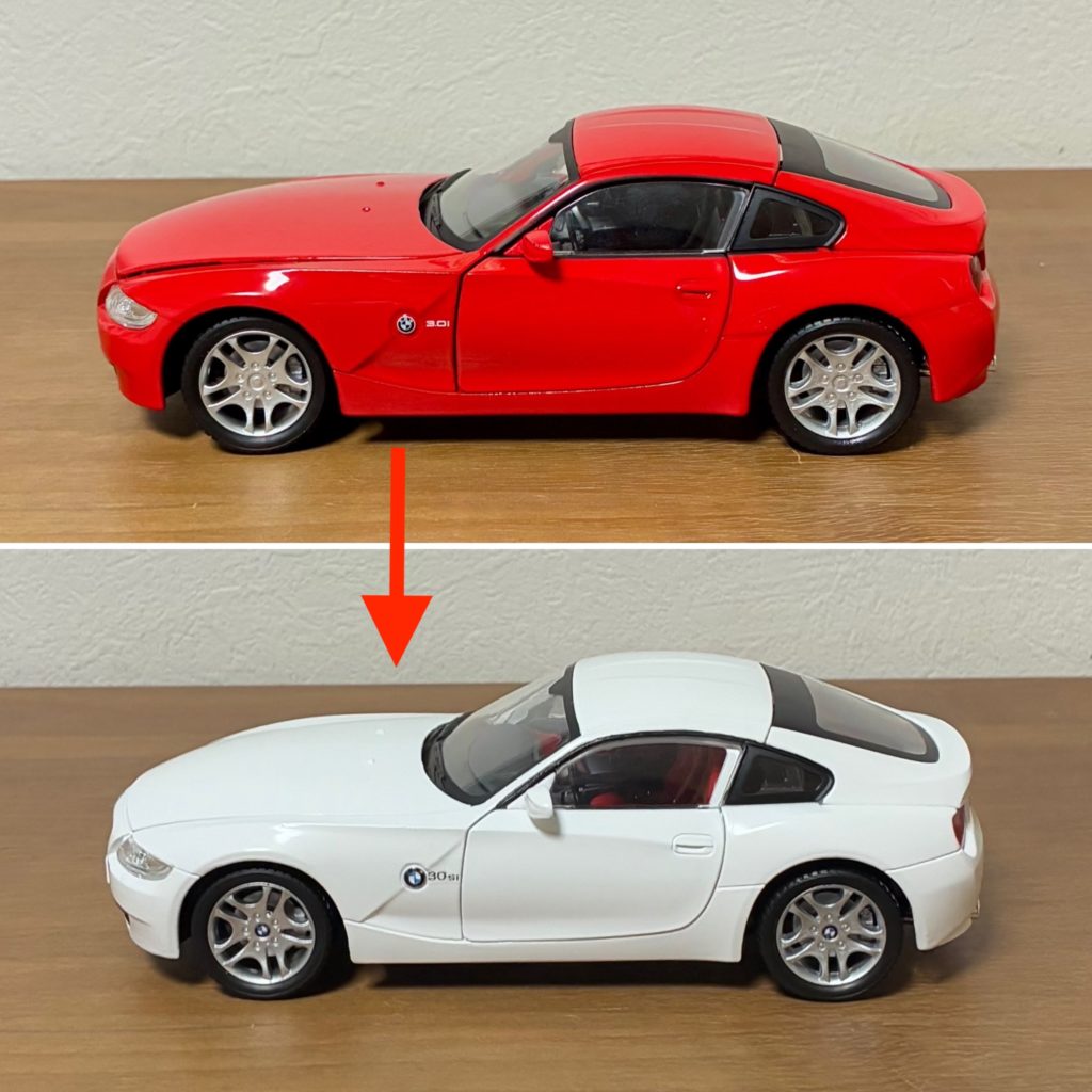 以前製作した「No.72 BMW Z4 クーペ(改造リペイント)」を見たお客様から同じミニカーのご依頼が入りました。今回はハンドルの改造なしで内装とボディのリペイントのみ行いました。