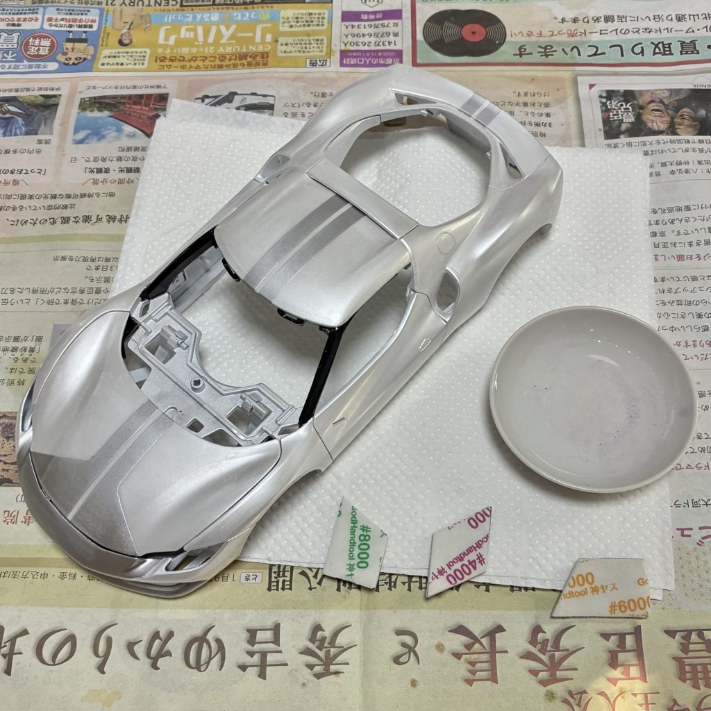 クリアーコートが十分乾燥したので、ボディをマスキングして、窓枠、ドアノブ、サイドモールなどをセミグロスブラックで塗装。