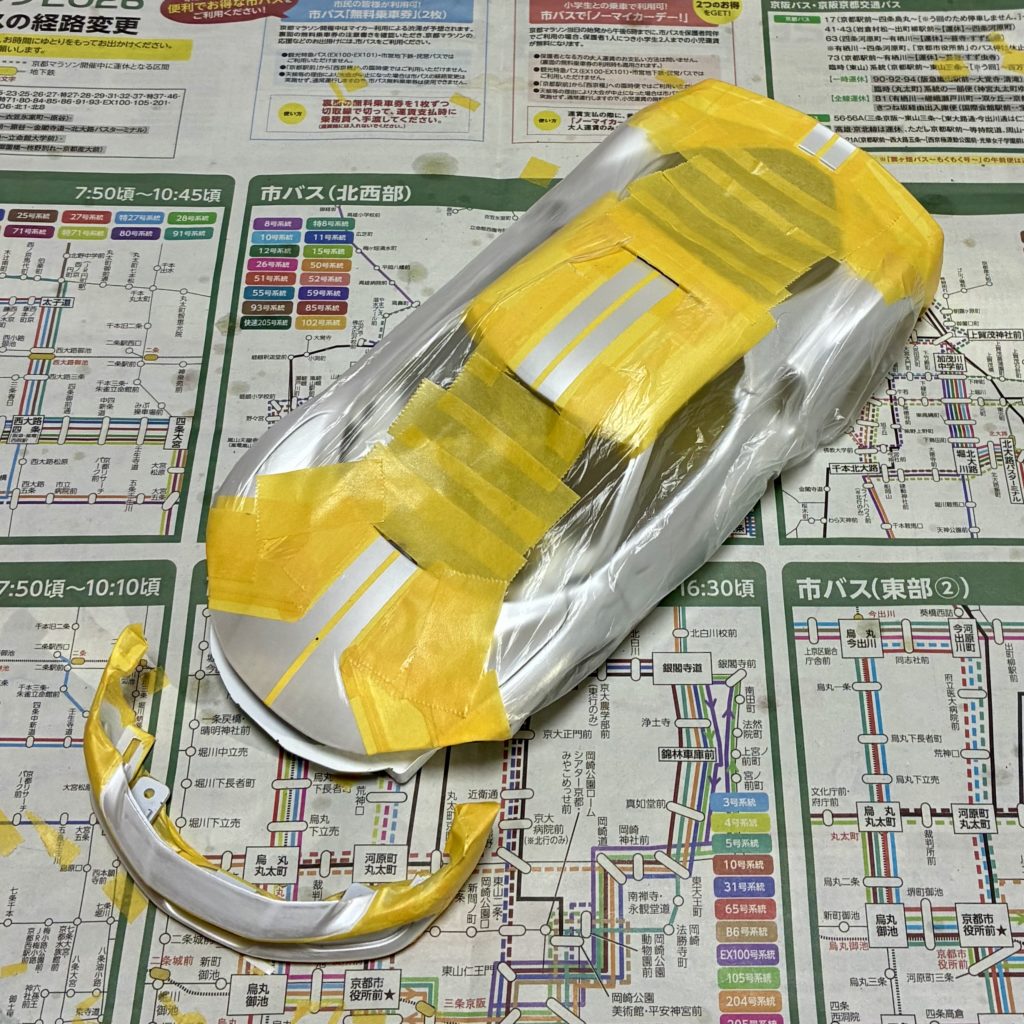 クリアーコートが十分乾燥したので、ボディをマスキングして、窓枠、ドアノブ、サイドモールなどをセミグロスブラックで塗装。