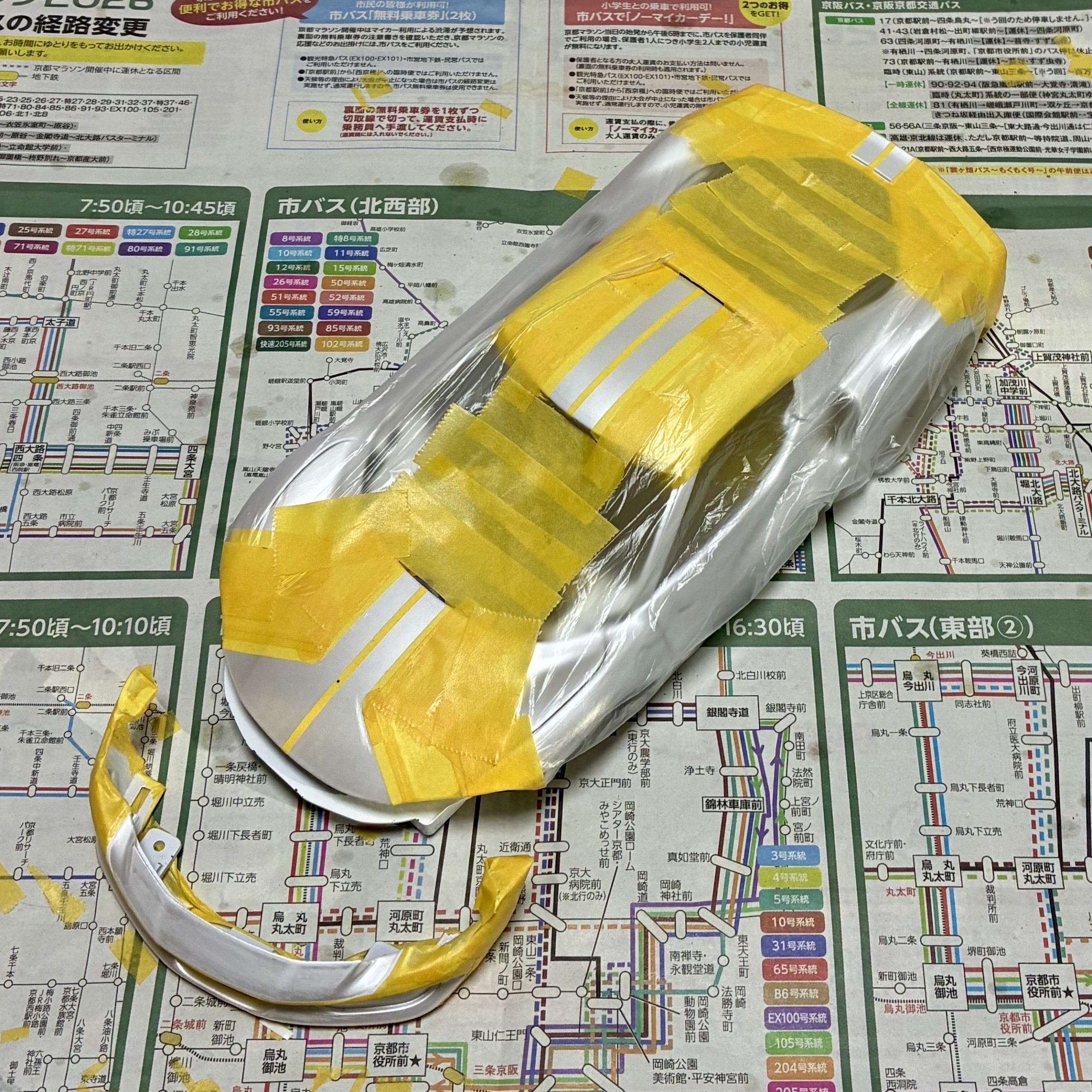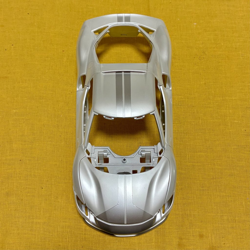 裏からセミグロスブラックでウィンドウを塗装。キットにマスキングシールが付属していて非常に助かりました。リアウィンドウは自分でマスキングをしてシルバーで塗装。