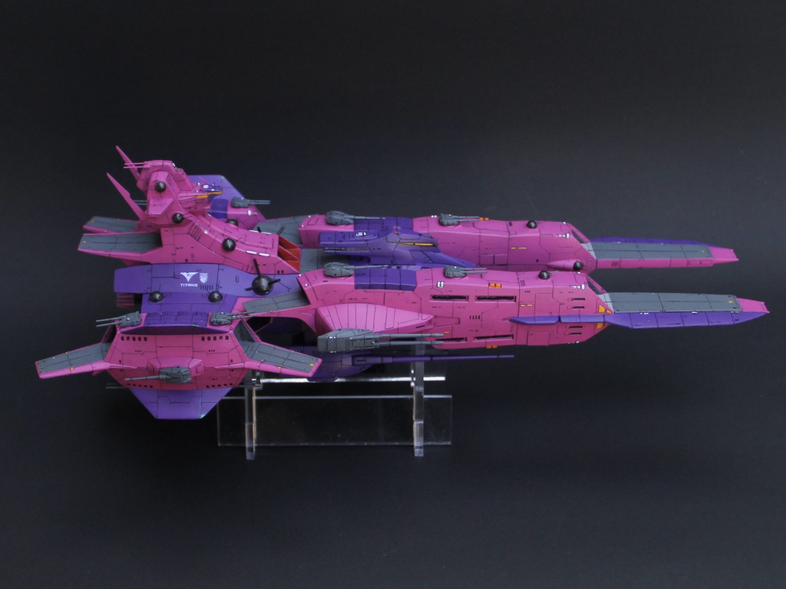 船体の一部、放熱板、ブリッジなどのパープル部分はクレオスの蛍光ピンク+パープル+クリアレッド+クリアブルー(45:25:20:10)で塗装。HGUCガザCの色を参考にしました。