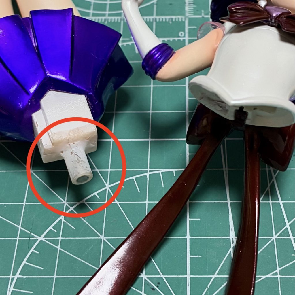 スカートのキャストオフがスムーズにいくように腰のダボをゆるめに削って磁石接続に加工。ダボの長さが足りないのでプラパイプで延長して、先端にネオジム磁石を埋め込みました。