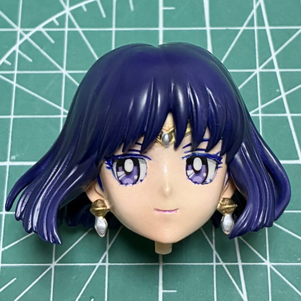 まゆとアイラインを描き込み。オリジナルのフギュアはかなり丸目で、これはこれで可愛いのですが、サターンはクールなイメージがあるので、少し切れ長の目に見えるように調整しました。