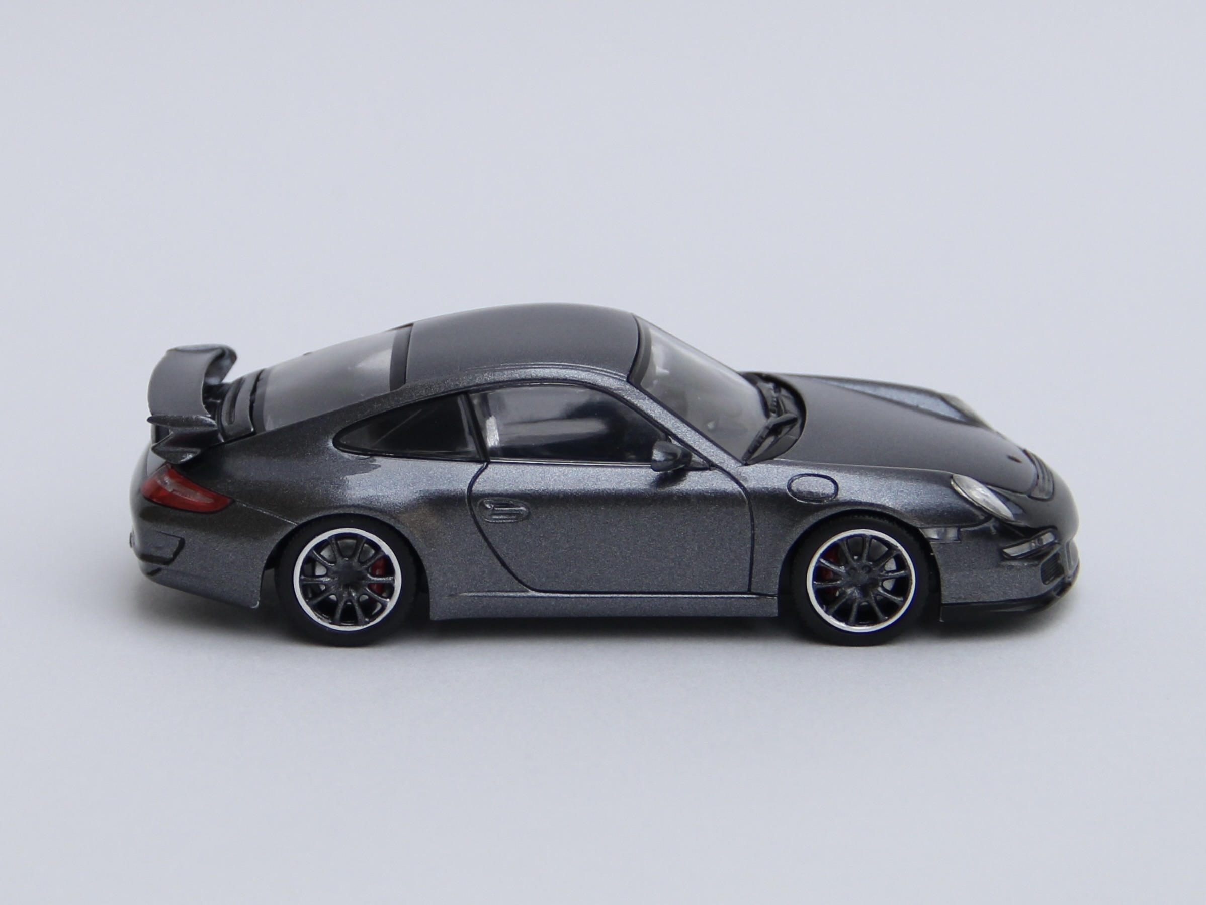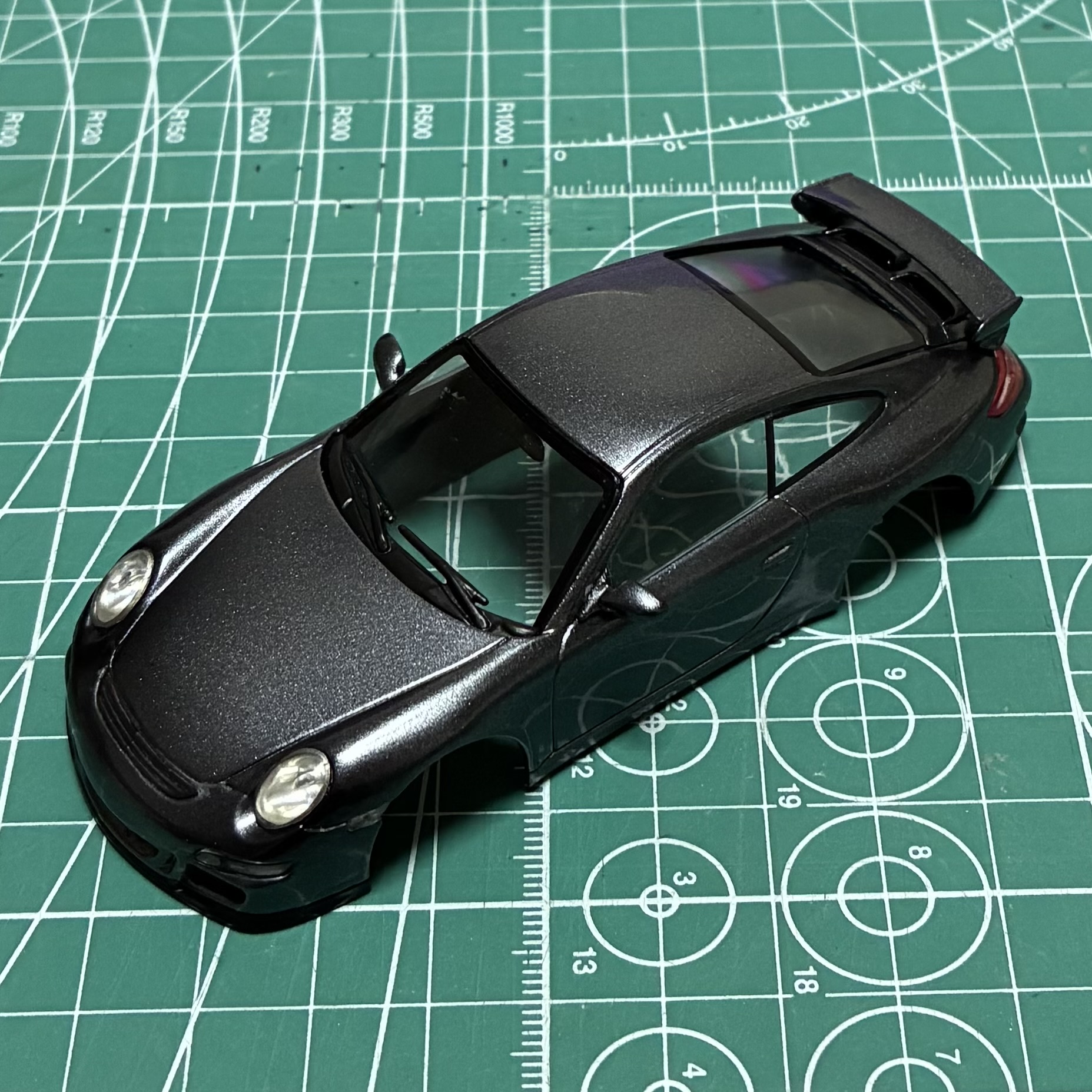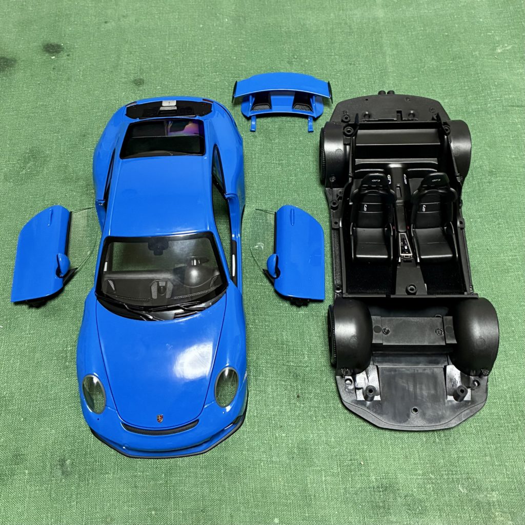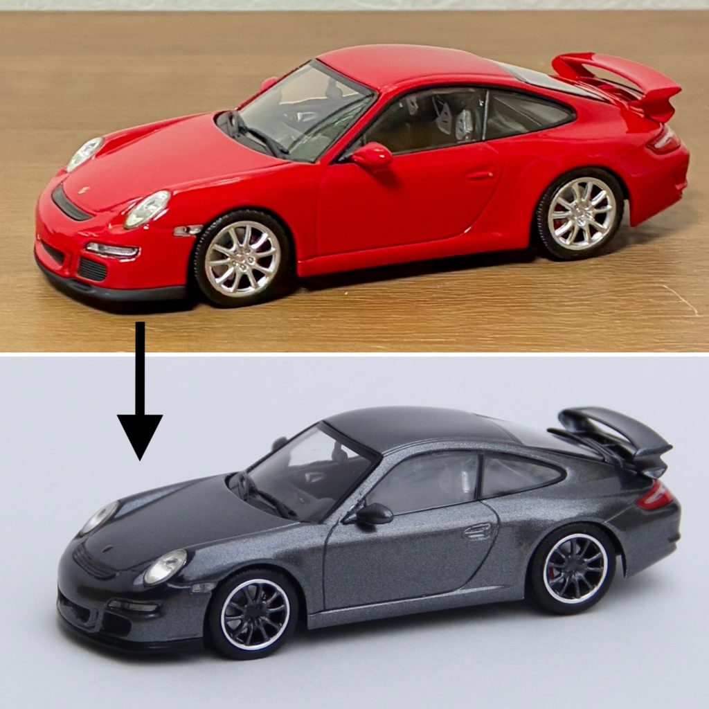 次の依頼品はポルシェ911GT3。レッドのボディをメタリックブラックににリペイントしました。ポルシェといえば何といっても911ですが、初代の901型、ターボ化された930型、4WDのカレラ4の964型、最後の空冷エンジン車の993型、完全フルモデルチェンジされた996型、ボディデザインが変更された997型、7代目 991型、8代目 992型と進化してきましたが、車名は常に「911」ですが、形式番号が同じ9で始まる三桁で新しいモデルの番号が若くなったりして混乱します😅😅😅