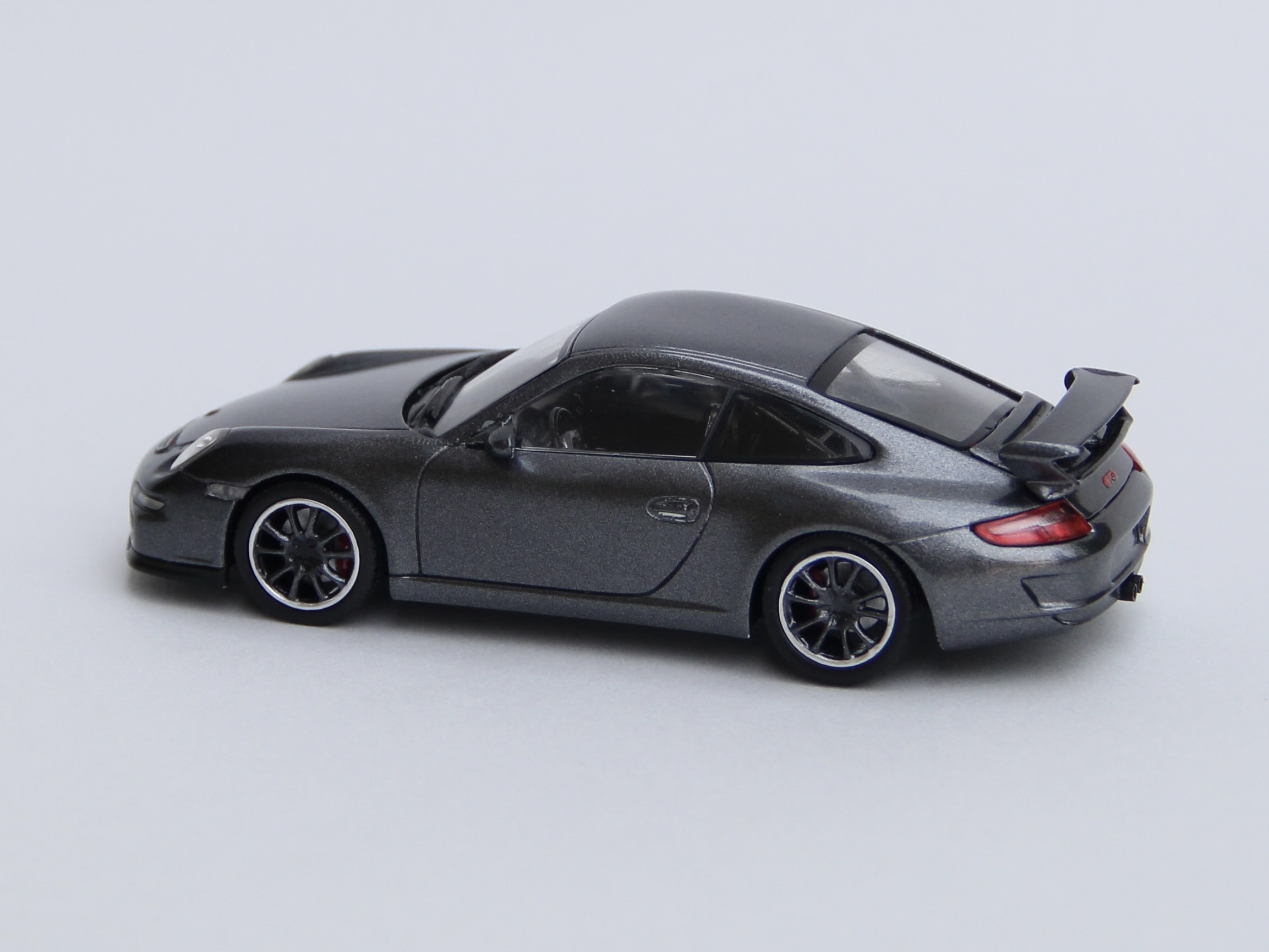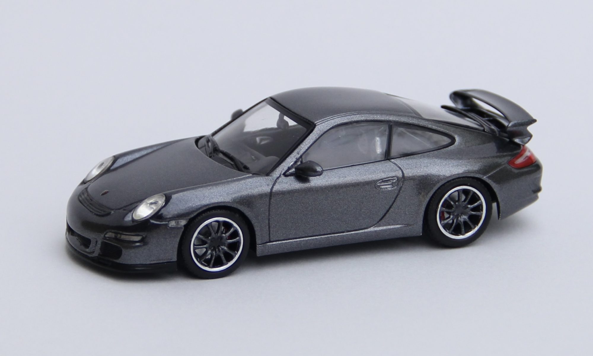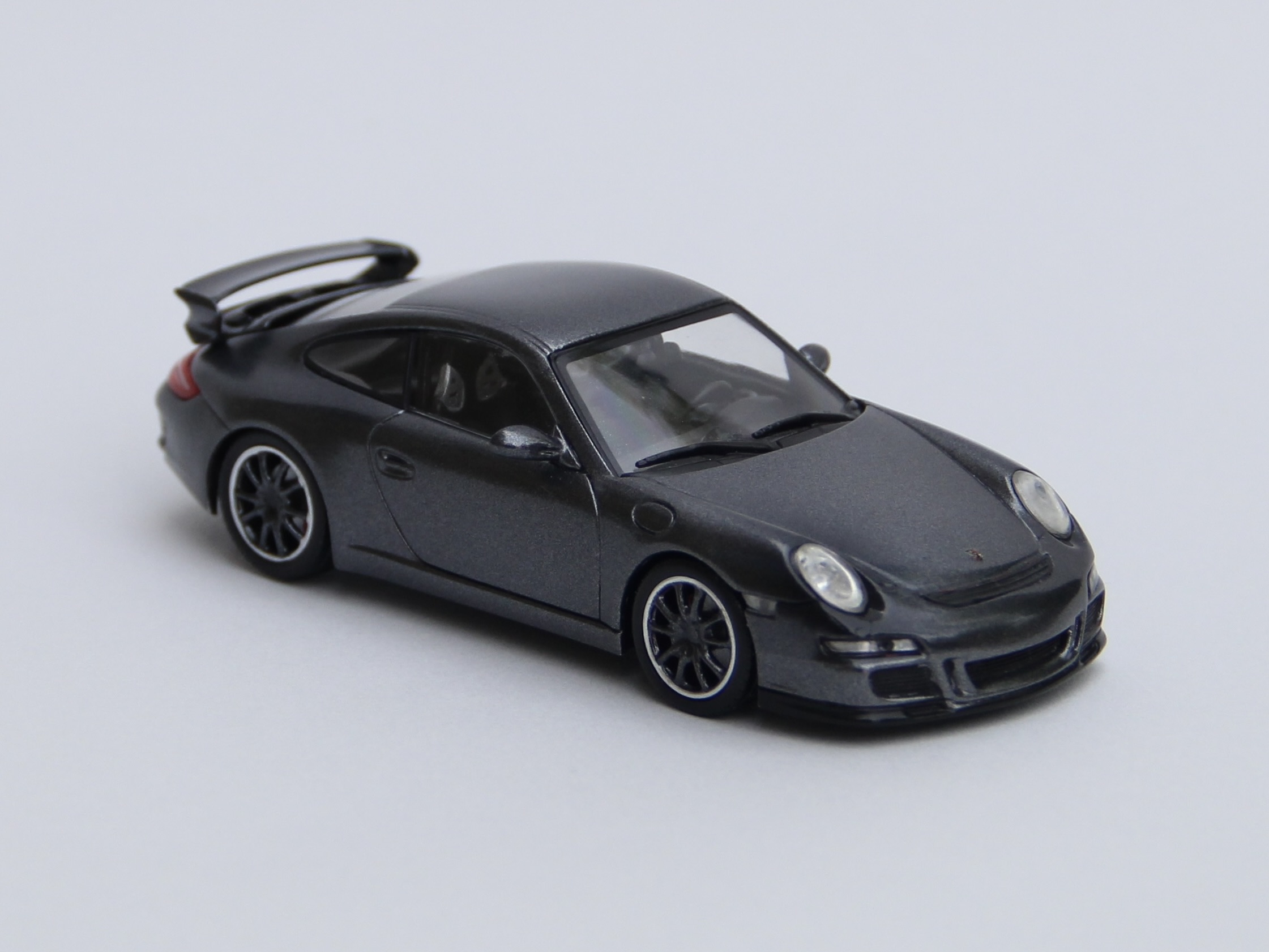 次の依頼品はポルシェ911GT3。レッドのボディをメタリックブラックににリペイントしました。ポルシェといえば何といっても911ですが、初代の901型、ターボ化された930型、4WDのカレラ4の964型、最後の空冷エンジン車の993型、完全フルモデルチェンジされた996型、ボディデザインが変更された997型、7代目 991型、8代目 992型と進化してきましたが、車名は常に「911」ですが、形式番号が同じ9で始まる三桁で新しいモデルの番号が若くなったりして混乱します😅😅😅