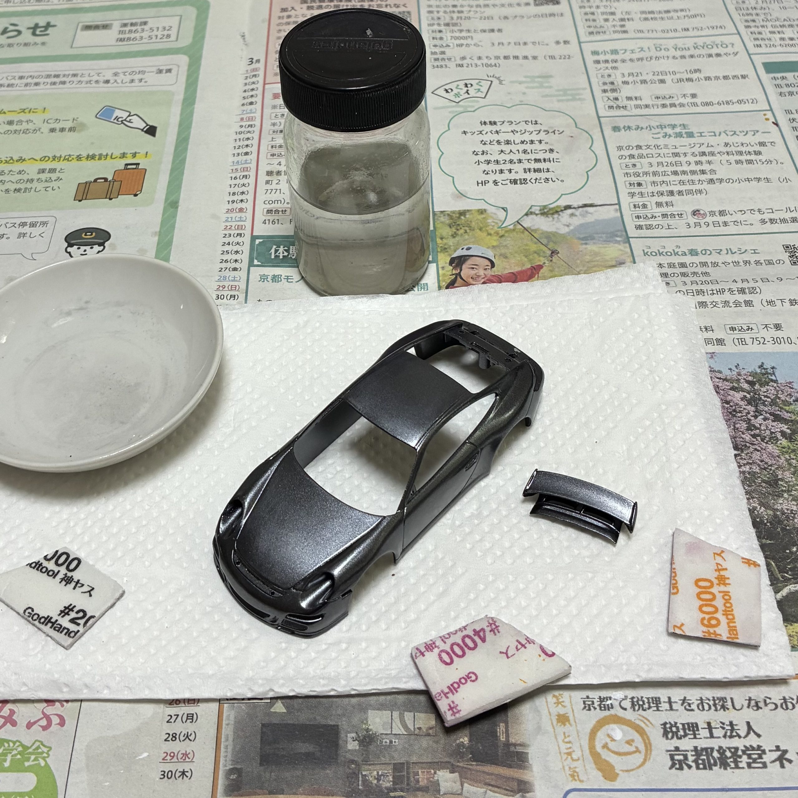 1000番〜4000番のヤスリでボディを研ぎ出しコンパウンドをかけてから、フロント部分をマスキングしてチンスポイラーをフラットブラックで塗装します。