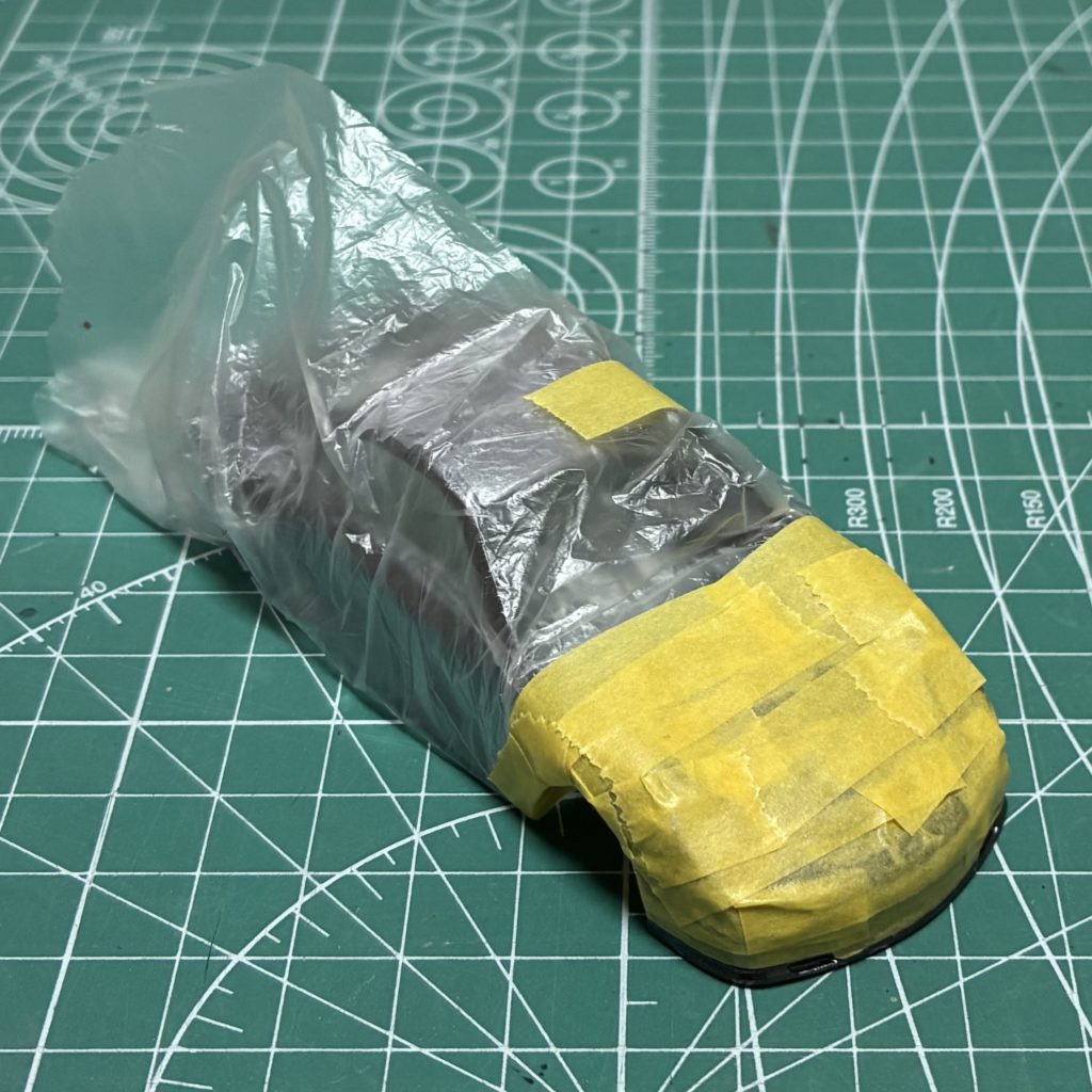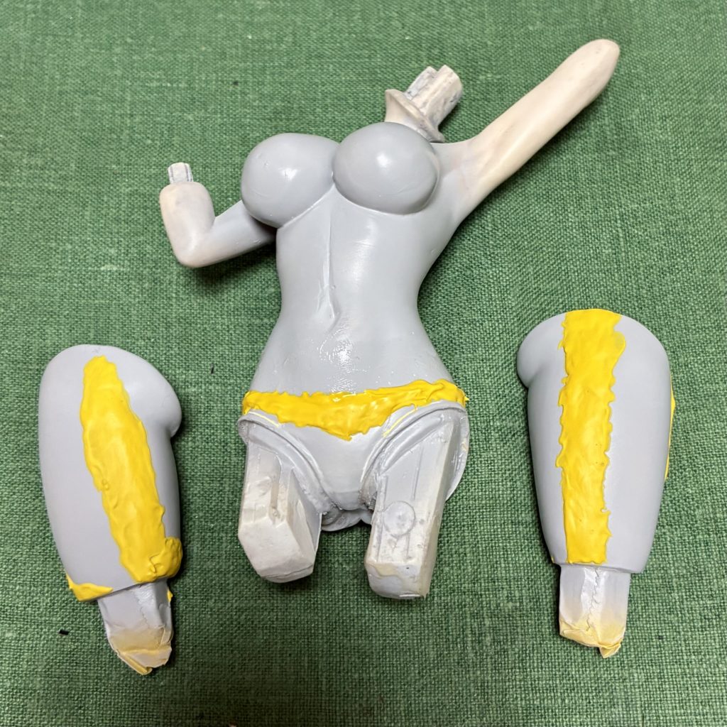 パテを盛った部分を削って表面処理。プライマーサフを吹いて表面の状態をチェック。パンツ部分は形状が分かりやすいように黒で仮塗装をしました。