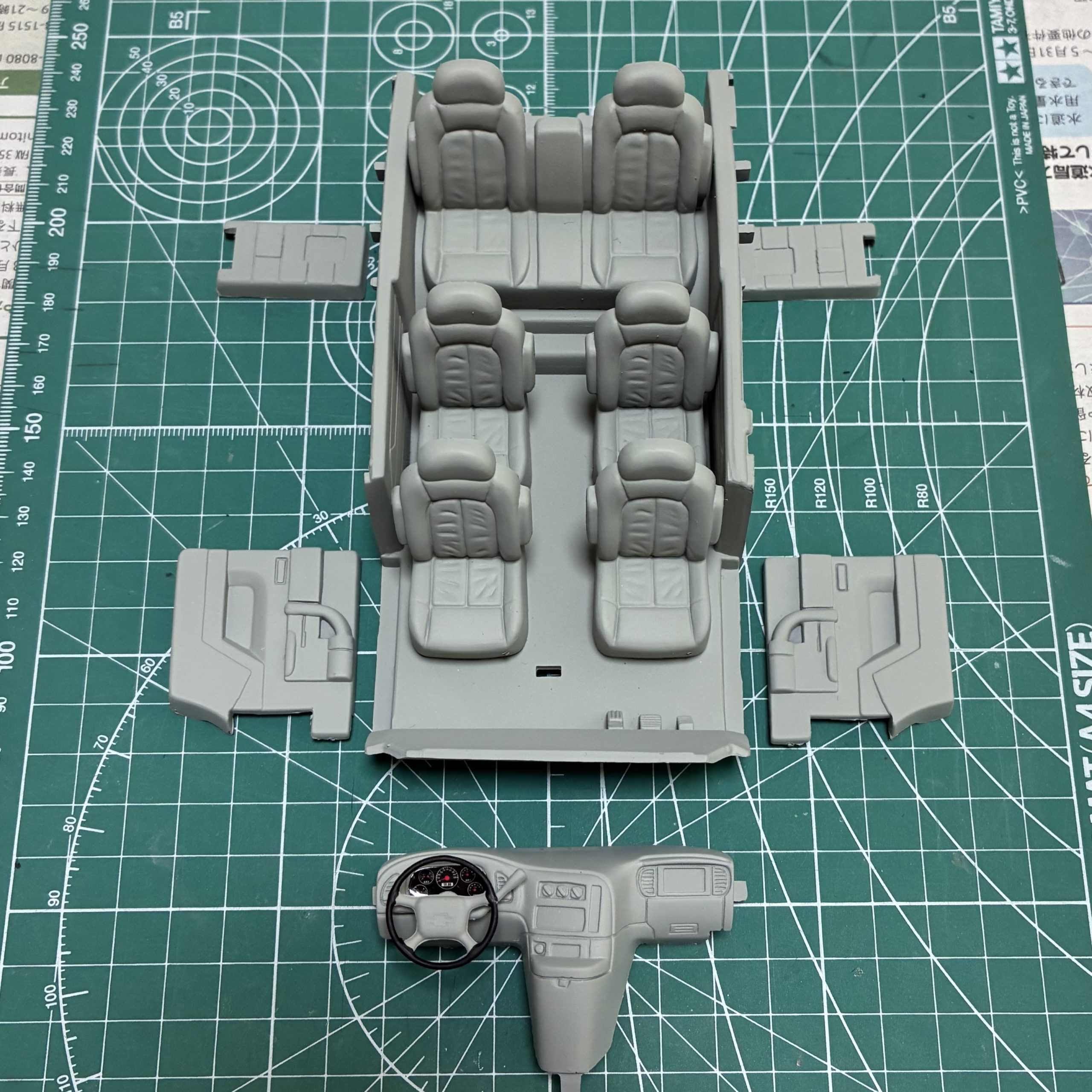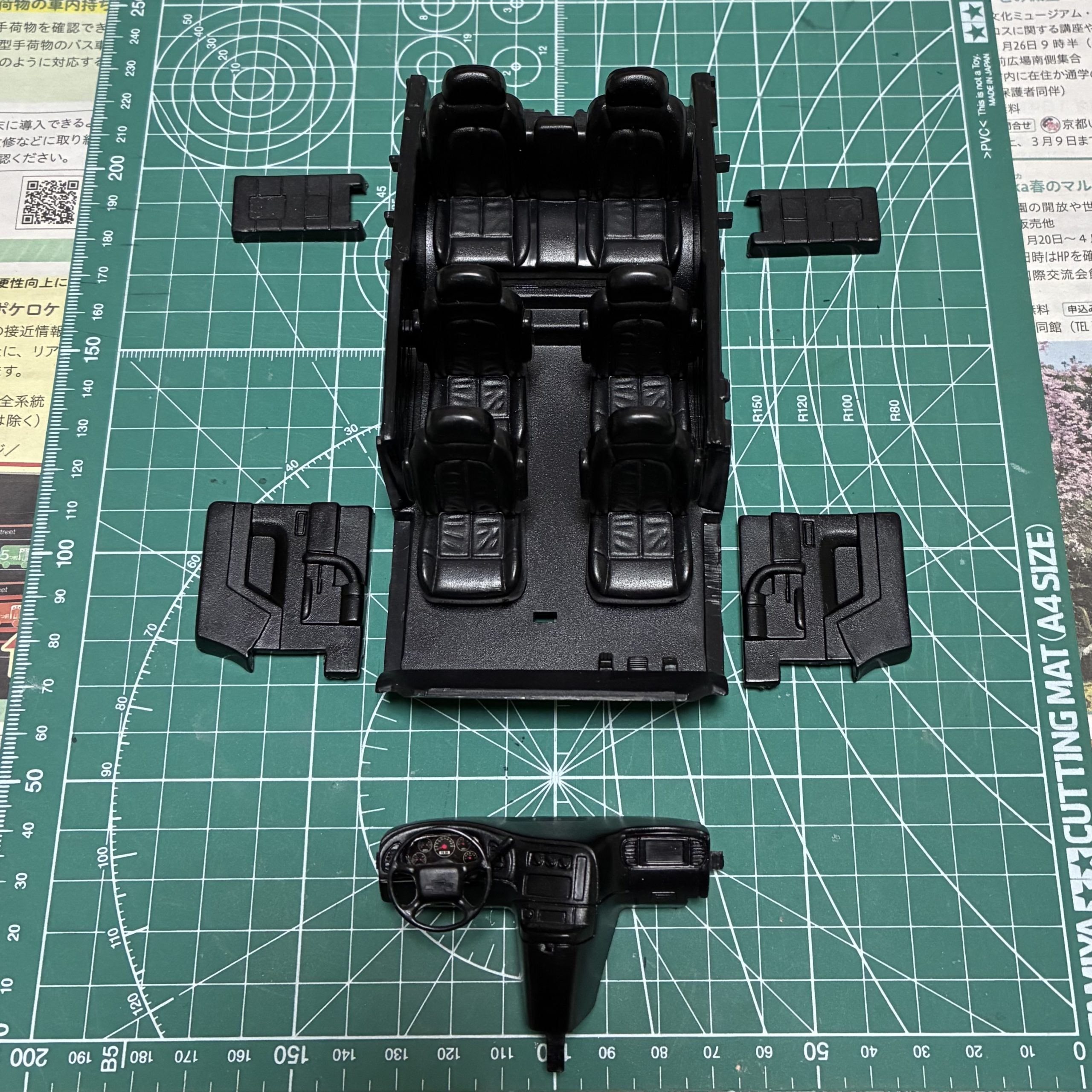 今回は自作パーツの製作に時間がかかるので、その間に内装の塗装を完了。メーターを残してガルグレーで塗装。ハンドルはフラットブラックで筆塗りしました。
