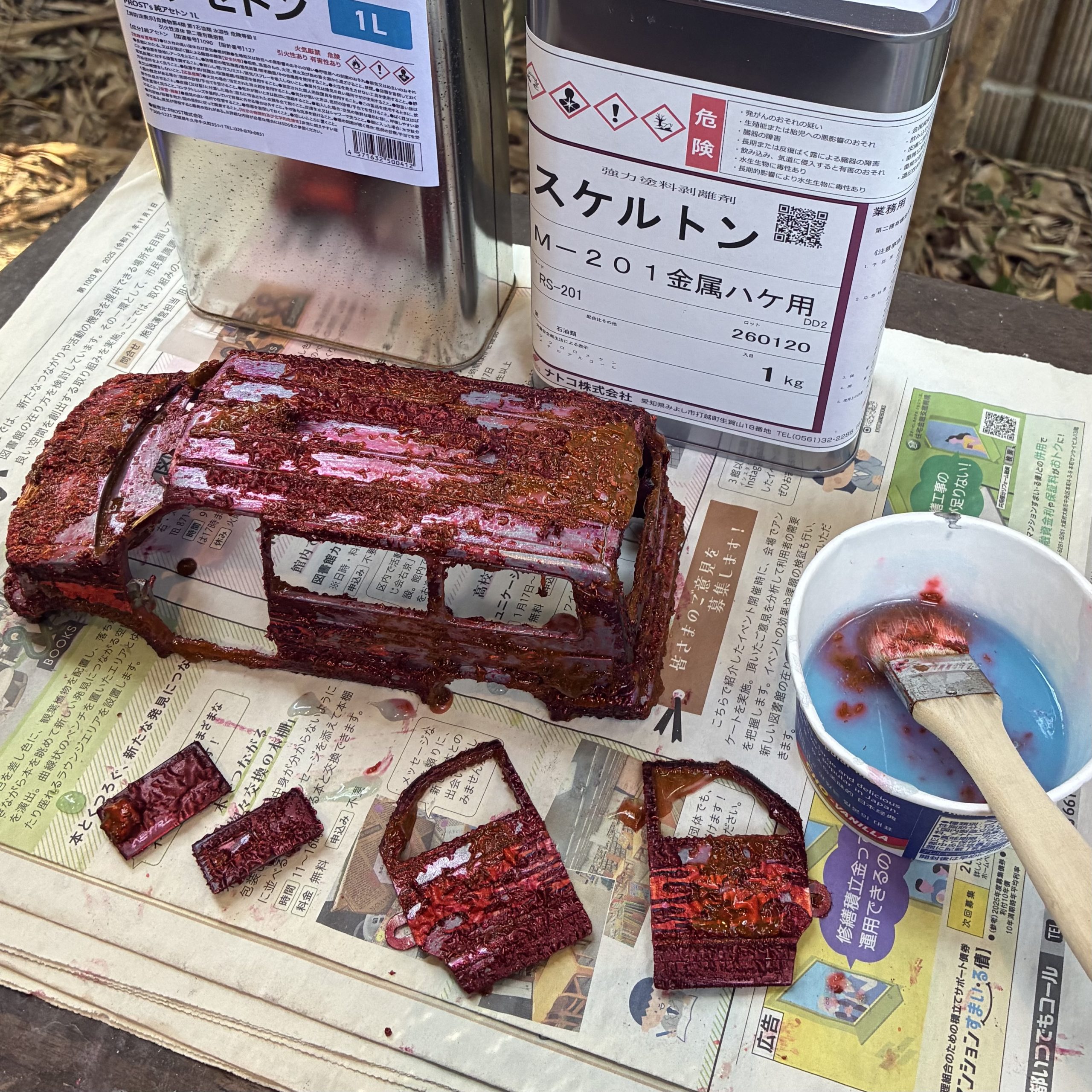 ナトコスケルトンを塗って塗装剥離。ナトコスケルトンは取り扱い注意ですが、剥離スピードが非常に早くて重宝しています。