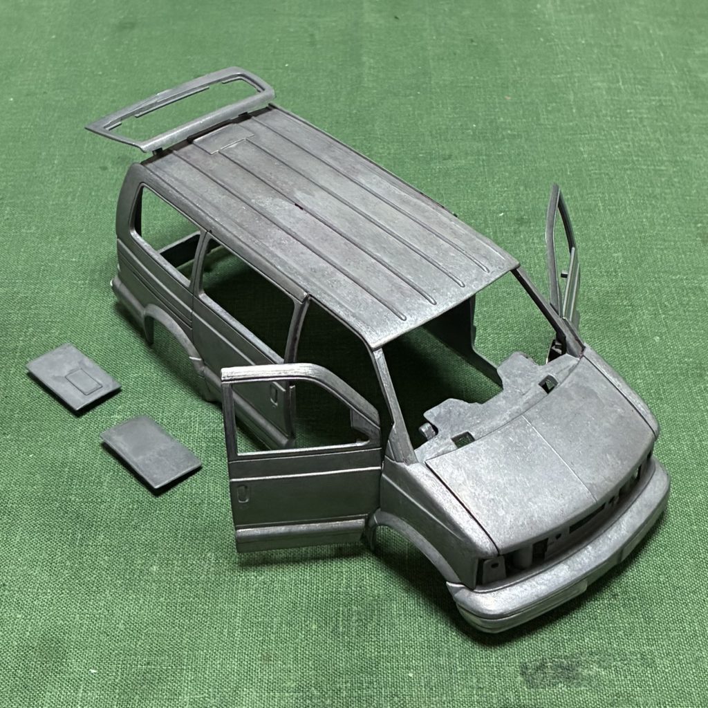ボンネットのヒンジもハメ殺しです。ドアは分解可能ですが、組み立て時に塗装面を傷つける心配があるので、このまま塗装することにしました。