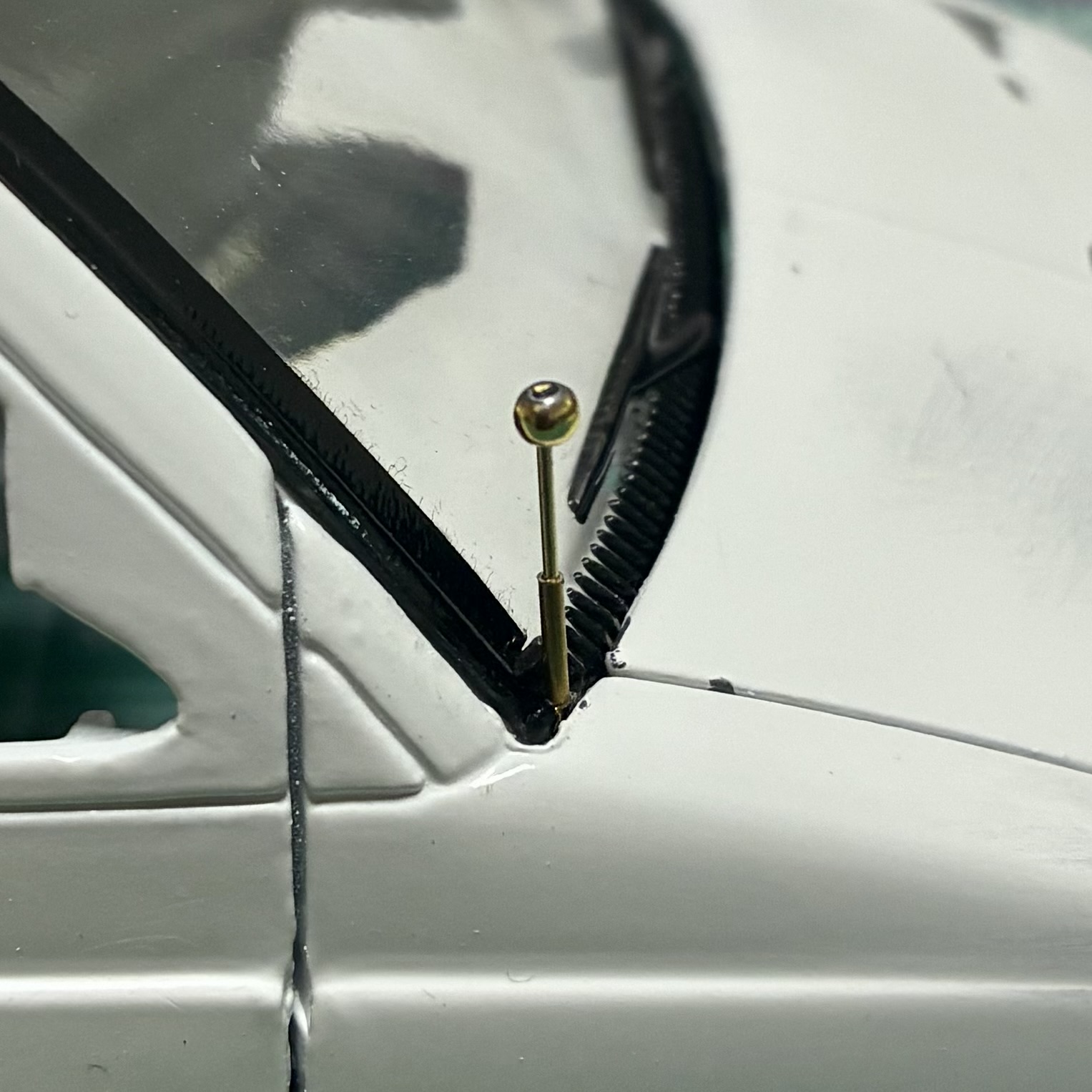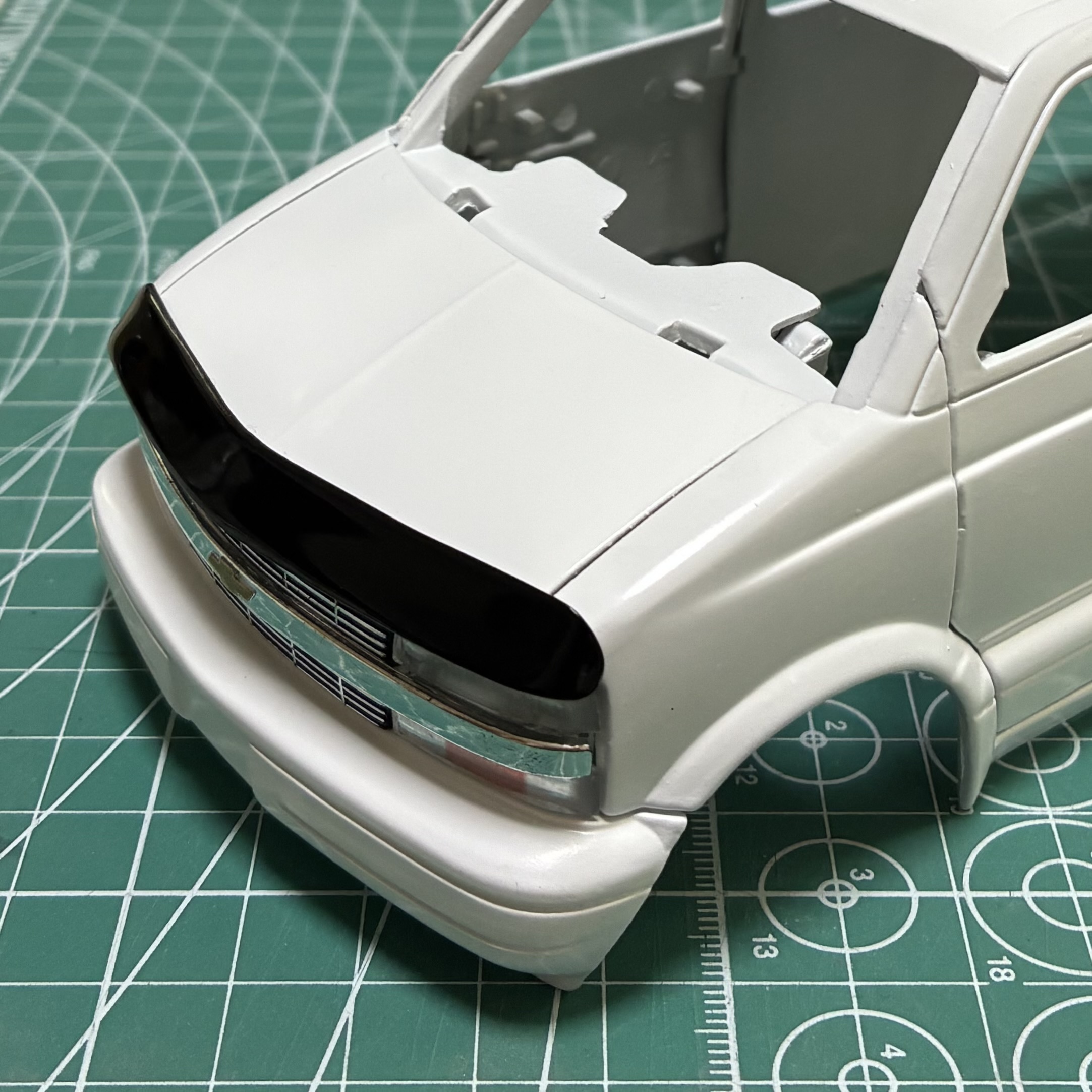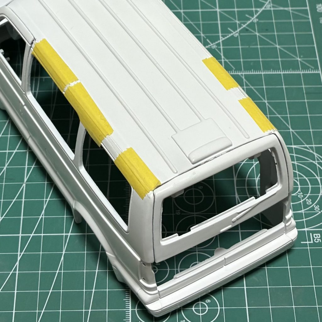 依頼者様の愛車には左右ドアの上に樹脂製のカバーのようなものがあるので、細切りのプラ板を貼って再現しました。