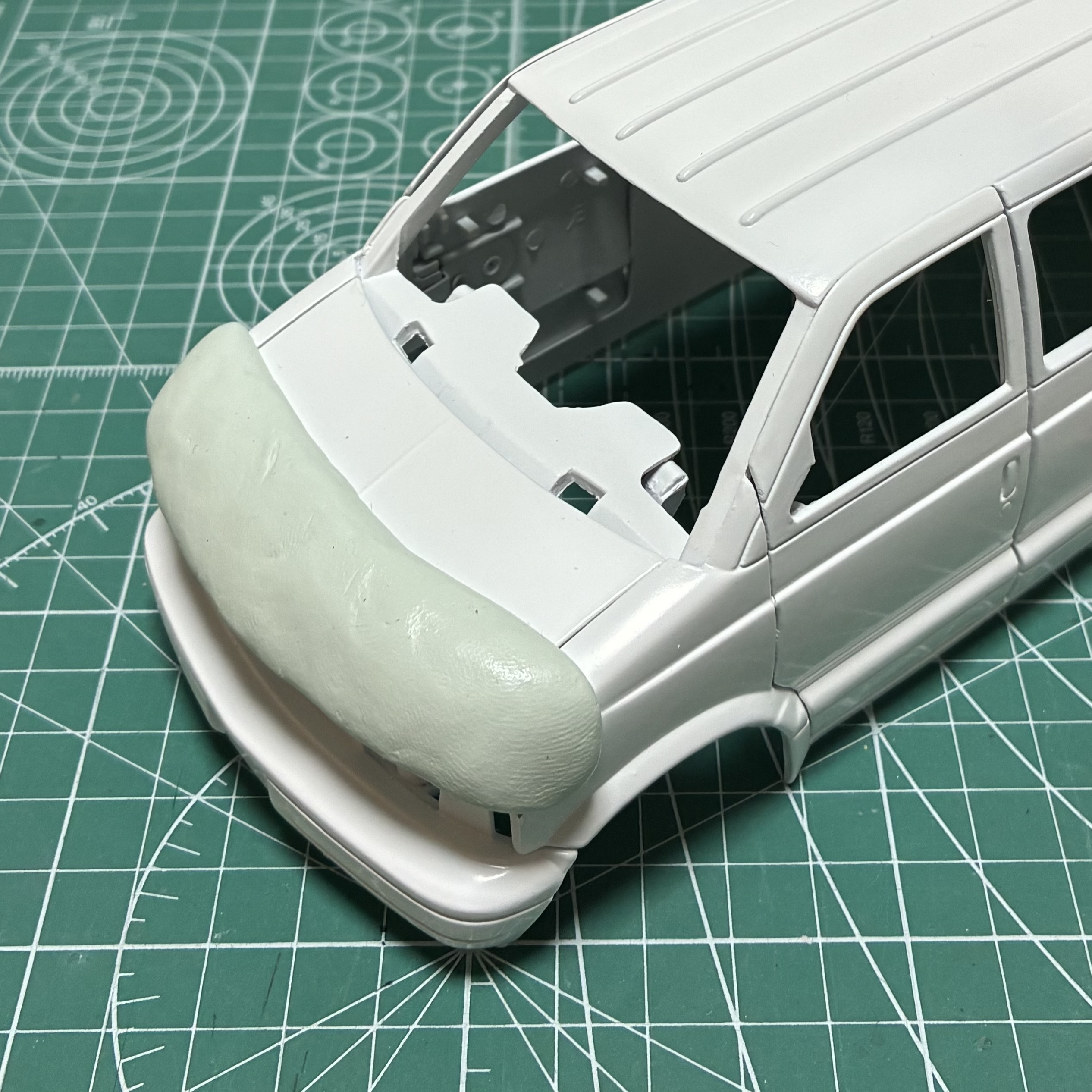 虫除けのバグガードを新造。まず、ミニカーのフロント部にメンソレタームを塗り、エポキシパテを押し付けて原型を作ります。