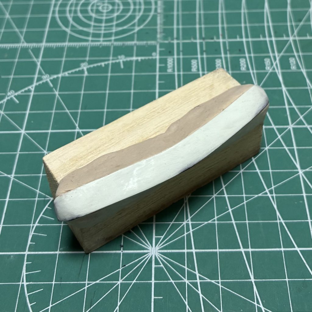 パテの部分をナイフと180番のヤスリで削って大まかにボディのラインを出します。