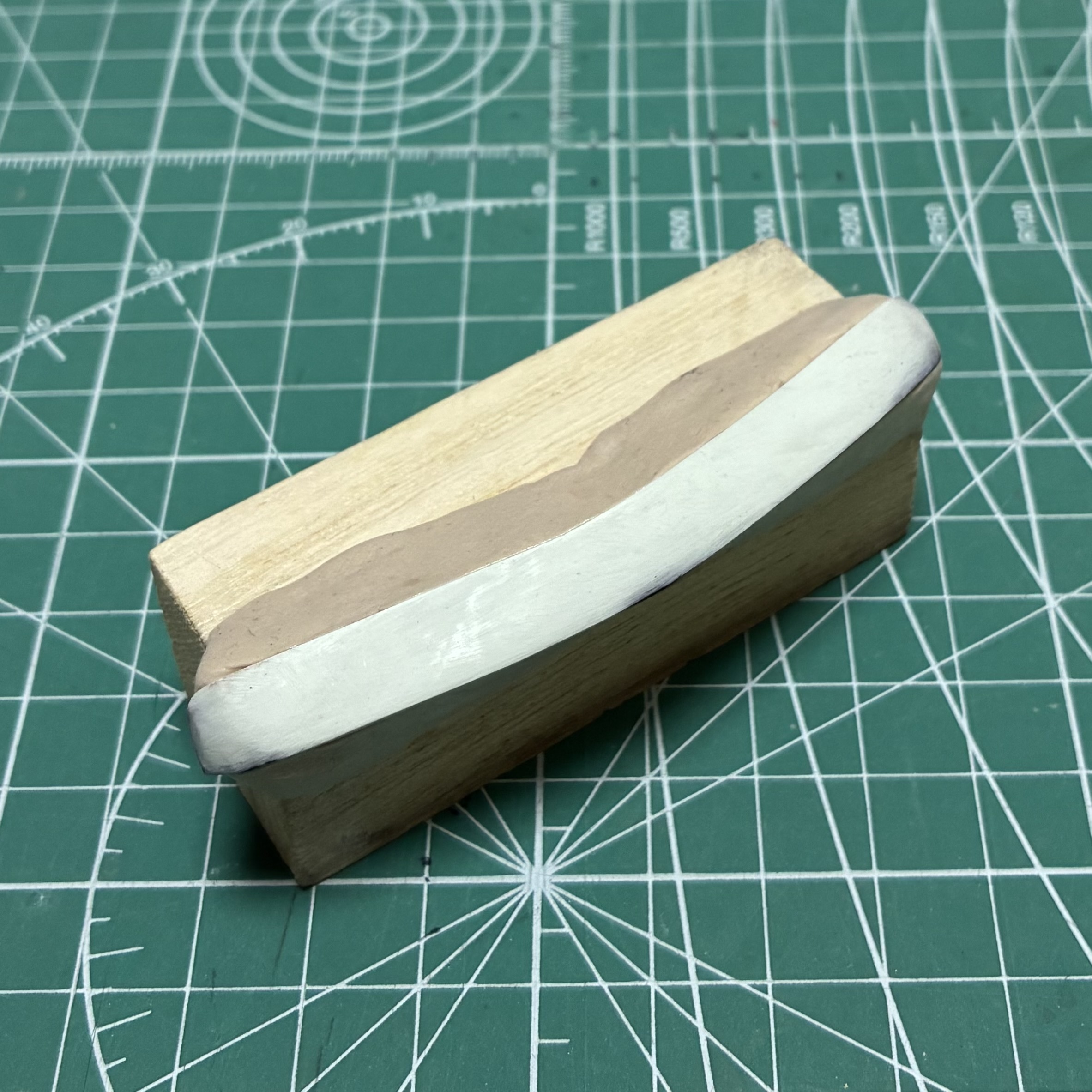 ナイフでカットして大まかに削り出してからヤスリをかけて形状や厚みを調整。逆Rをつける必要があるので、作業がしやすいように専用の治具を作りました。