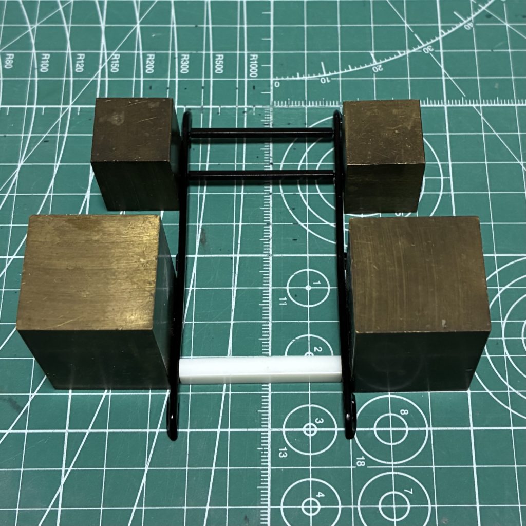 左右のバーを横棒に接着。平行がキチンとでるように真鍮ブロックで固定します。