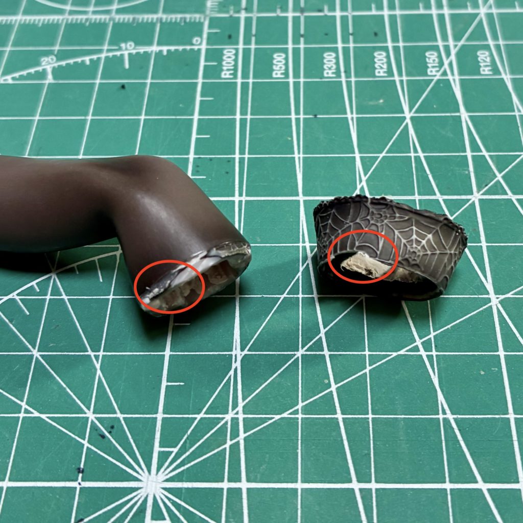できるだけ丁寧に分解しましたが、ストッキングのレース部分はパーツが薄くてちぎれてしまったので、接着しなおしてきれいに補修をします。
