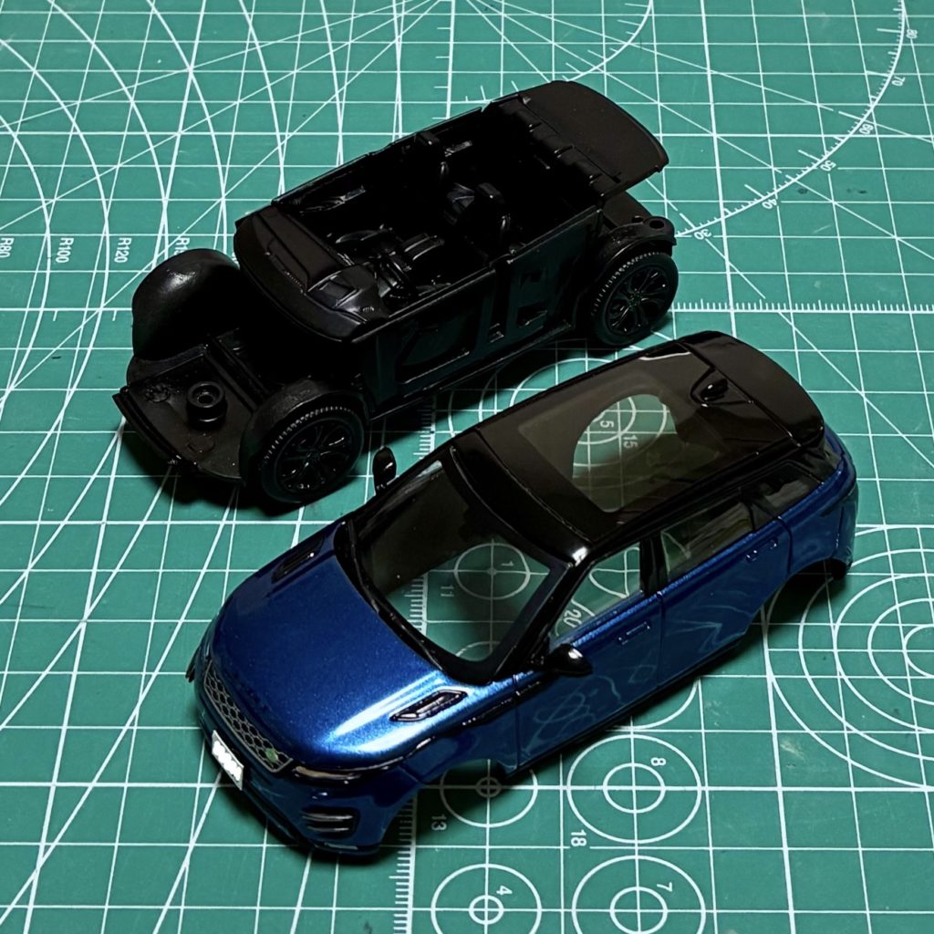 熱湯につけて接着剤を柔らかくして分解。サンルーフ部分は成形品ではなく透明プラ板製なので変形しないよう注意が必要です。